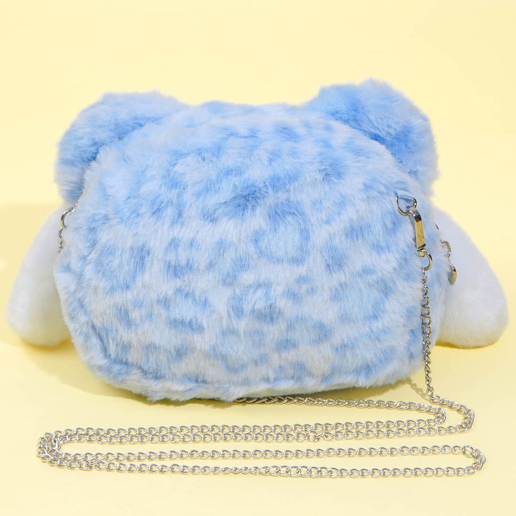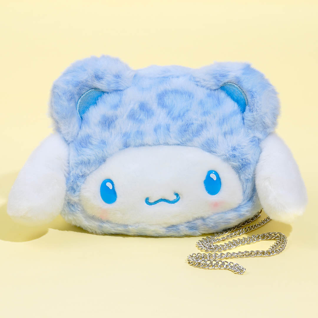 Bring your phone and wallet anywhere using this super cute pochette sling bag! It's shaped like Cinnamoroll's face wearing a leopard print bear headgear. This bag has a heart-shaped zipper closure and a removable chain shoulder strap.