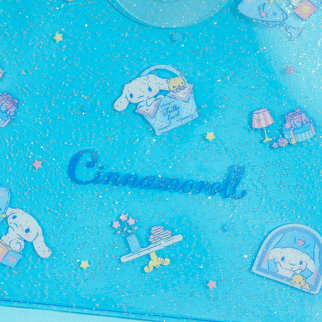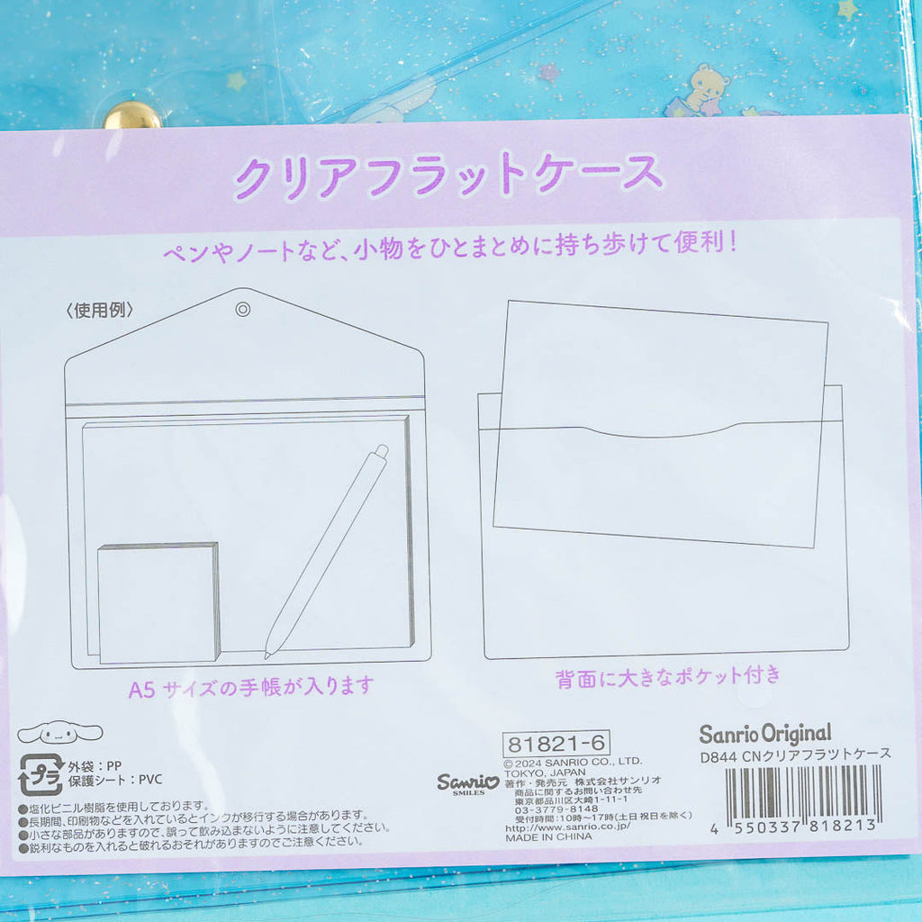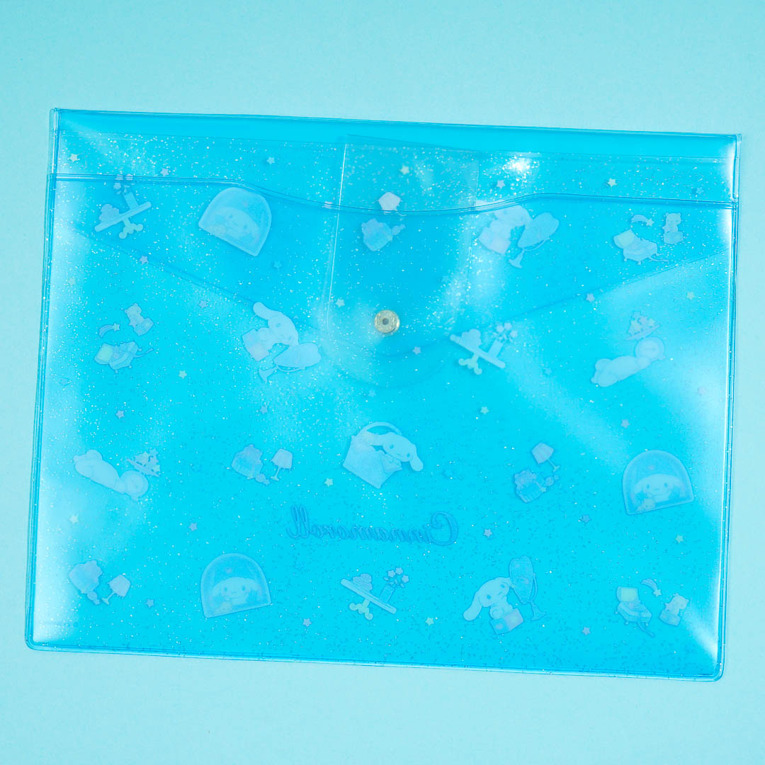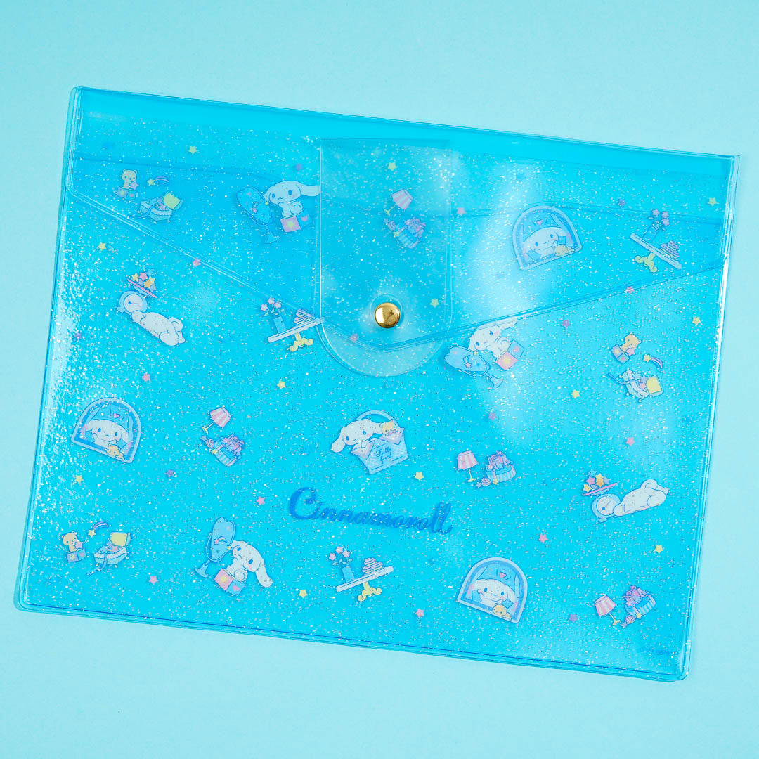 This super cute clear envelope is perfect for keeping your letters and other A5-sized documents! It features glittery prints of Cinnamoroll in his lovely house. This envelope has a snap button closure and a back pocket so you can organize your files.