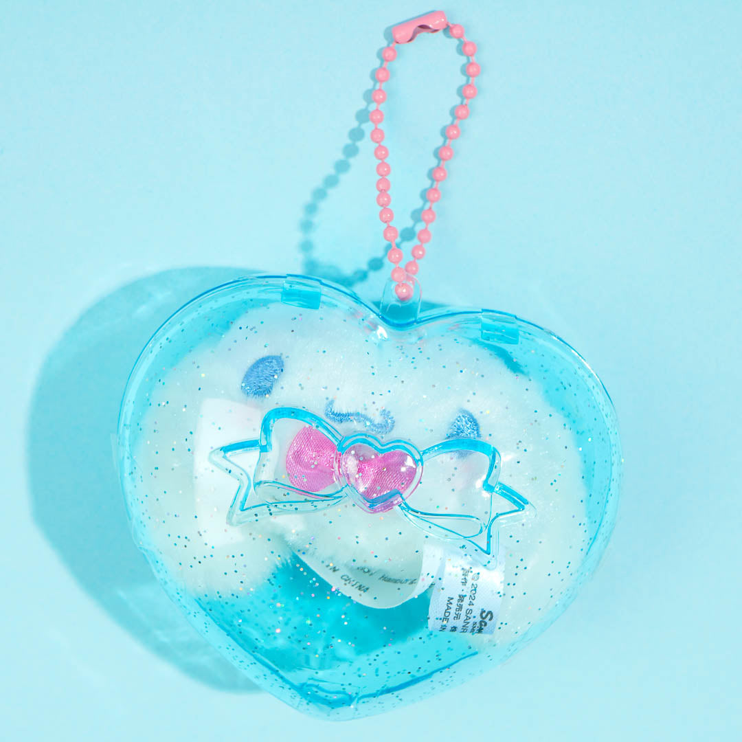 Kawaii-fy your pouch or your bag with this cute glittery heart case charm. Inside is a cute Cinnamoroll mini plushie! You can open and close the case to play with Cinnamoroll.
