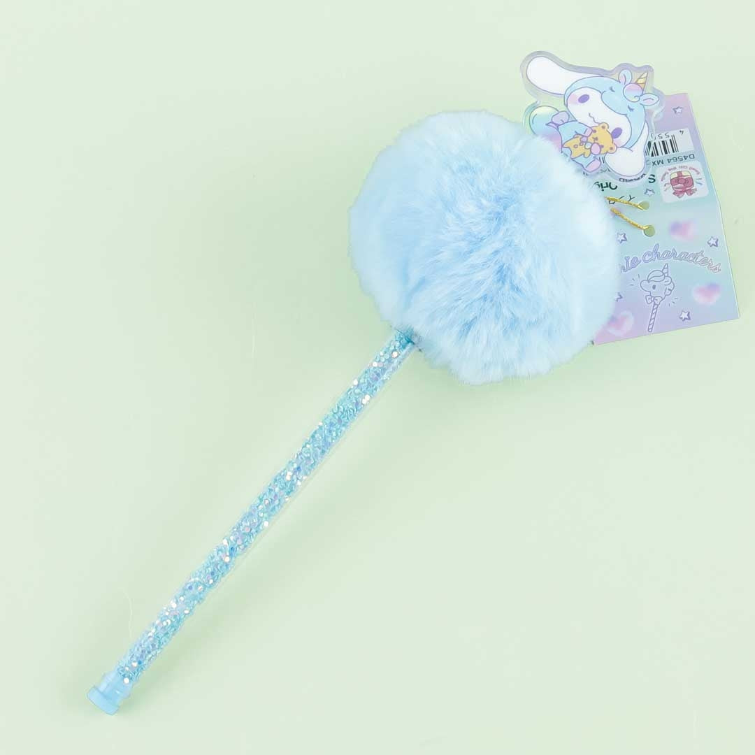 A sparkly pen with a cap that has a furball and an acrylic charm of Cinnamoroll wearing a unicorn costume