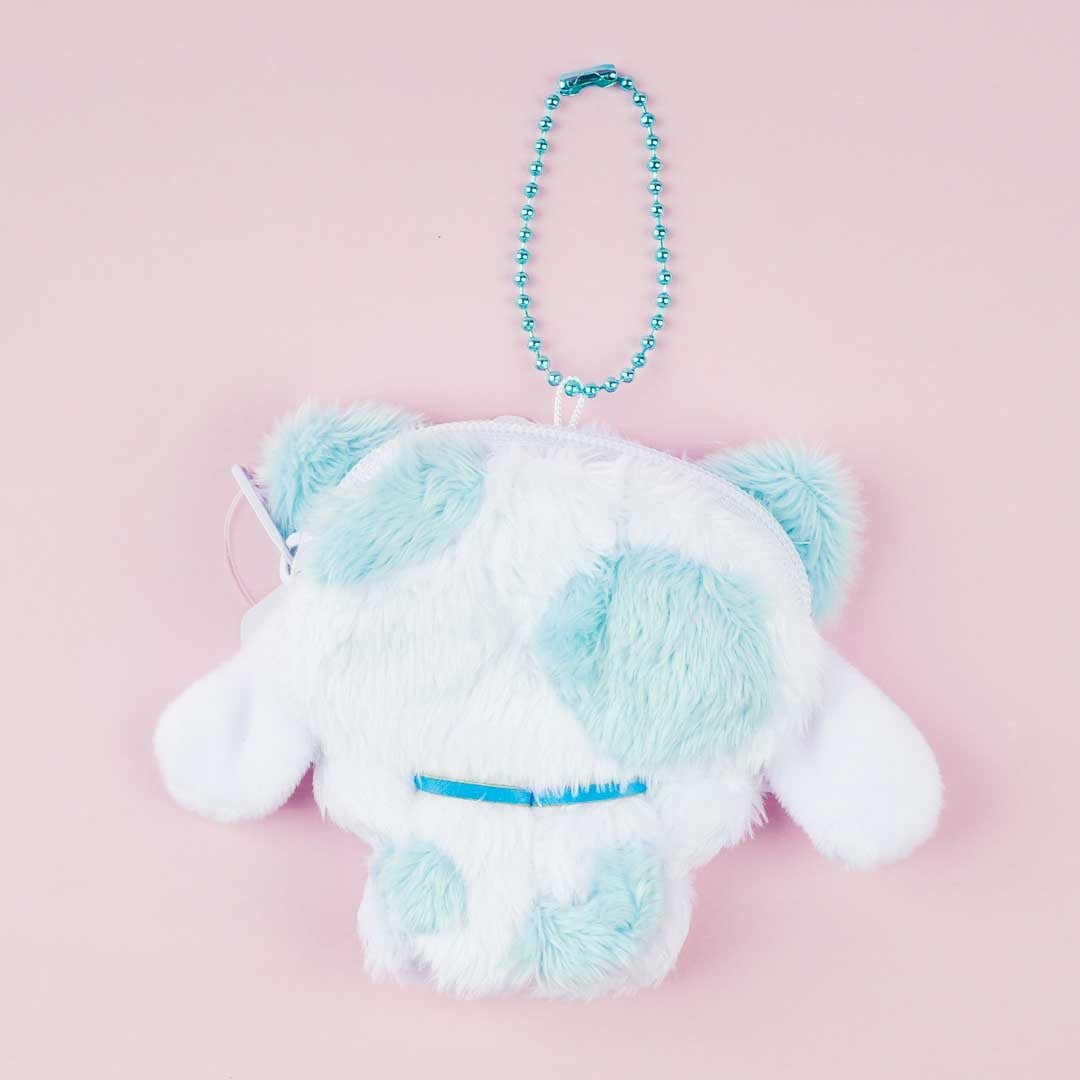 A fluffy Cinnamoroll cat plushie coin purse that doubles as a bag charm