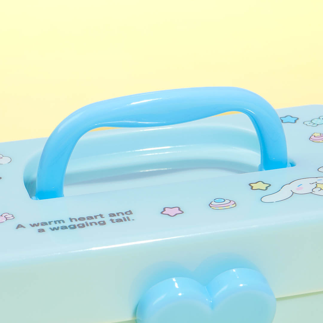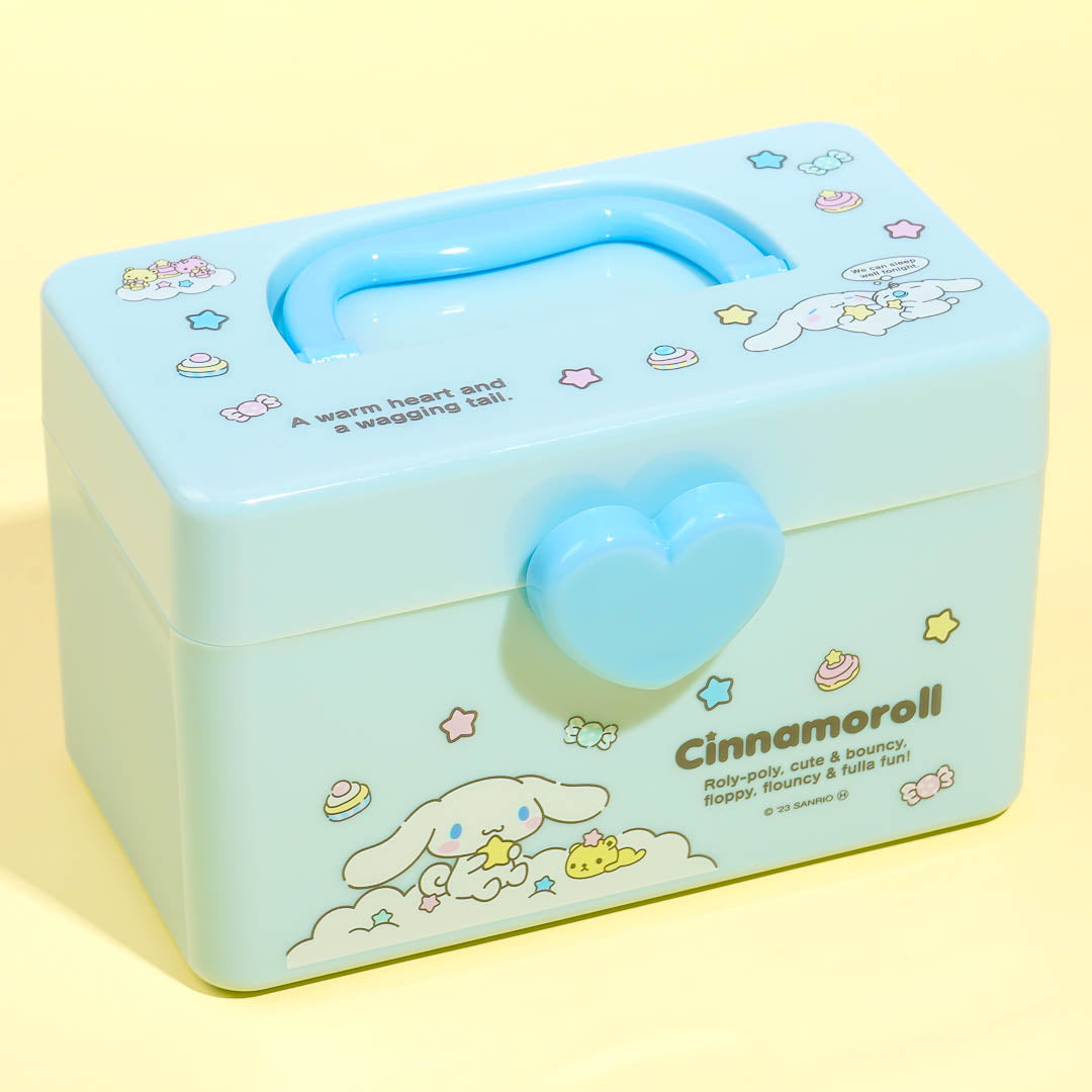This cute storage box is decorated with prints of Cinnamoroll playing around! It has a heart-shaped lock, a handle, and an inner detachable tray. Use this storage box to arrange your makeup, hair ties, and other things.