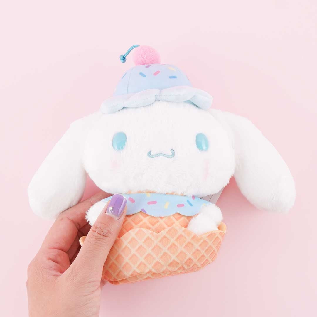 Add this Cinnamoroll plushie in an ice cream costume to your collection! This medium-sized cutie is made of super-soft polyester and is sitting on a detachable cone.