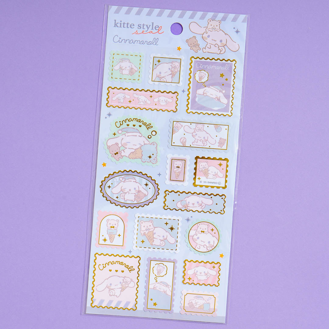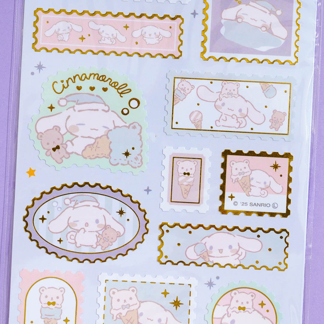 Have fun decorating your planner with this super cute sheet of stickers. It showcases Cinnamoroll playing around, sleeping, and having a good time. These stickers have nice gold accents!