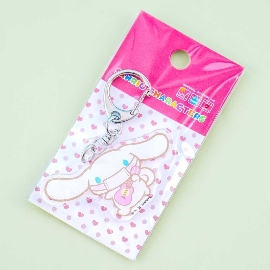 A super kawaii acrylic charm illustrated with Cinnamoroll wearing a mask while carrying a guitar
