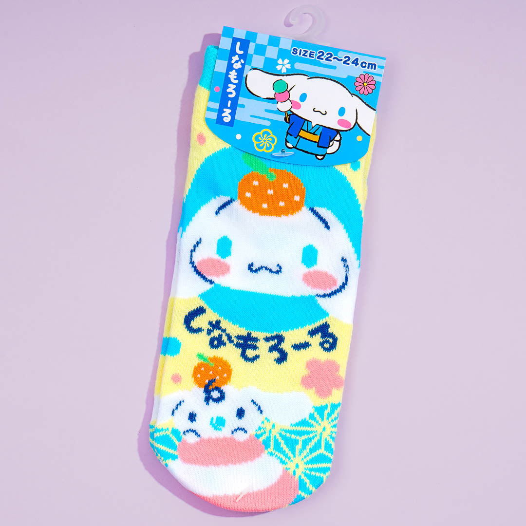 This super kawaii pair of socks showcases prints of Cinnamoroll balancing an orange on top of his head with his friend, Milk! Wear these socks when you're going cafe-hopping with your buddies.