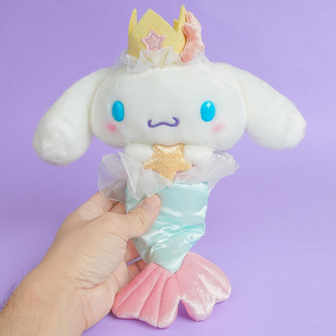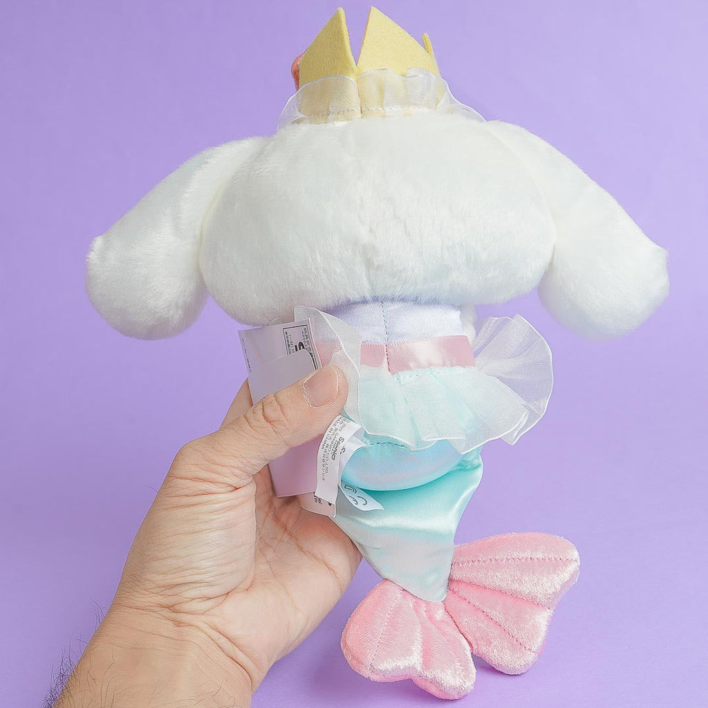 This medium-sized cute Cinnamoroll plushie is dressed as a mermaid with a matching starfish crown. It can sit upright so you can easily place it on your shelf as an addition to your kawaii Sanrio collection!