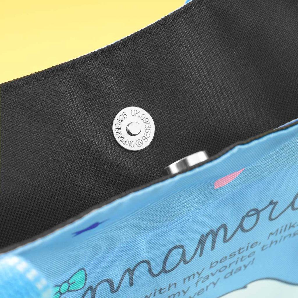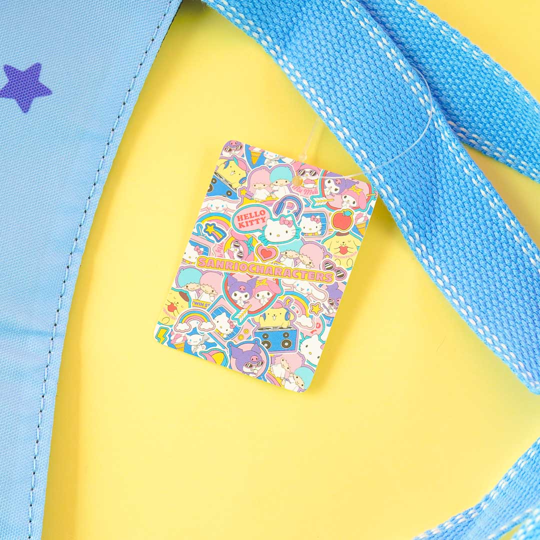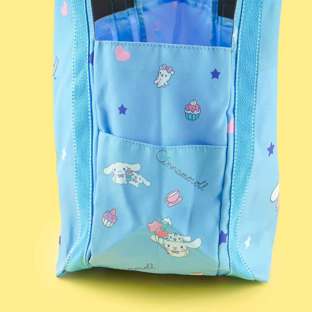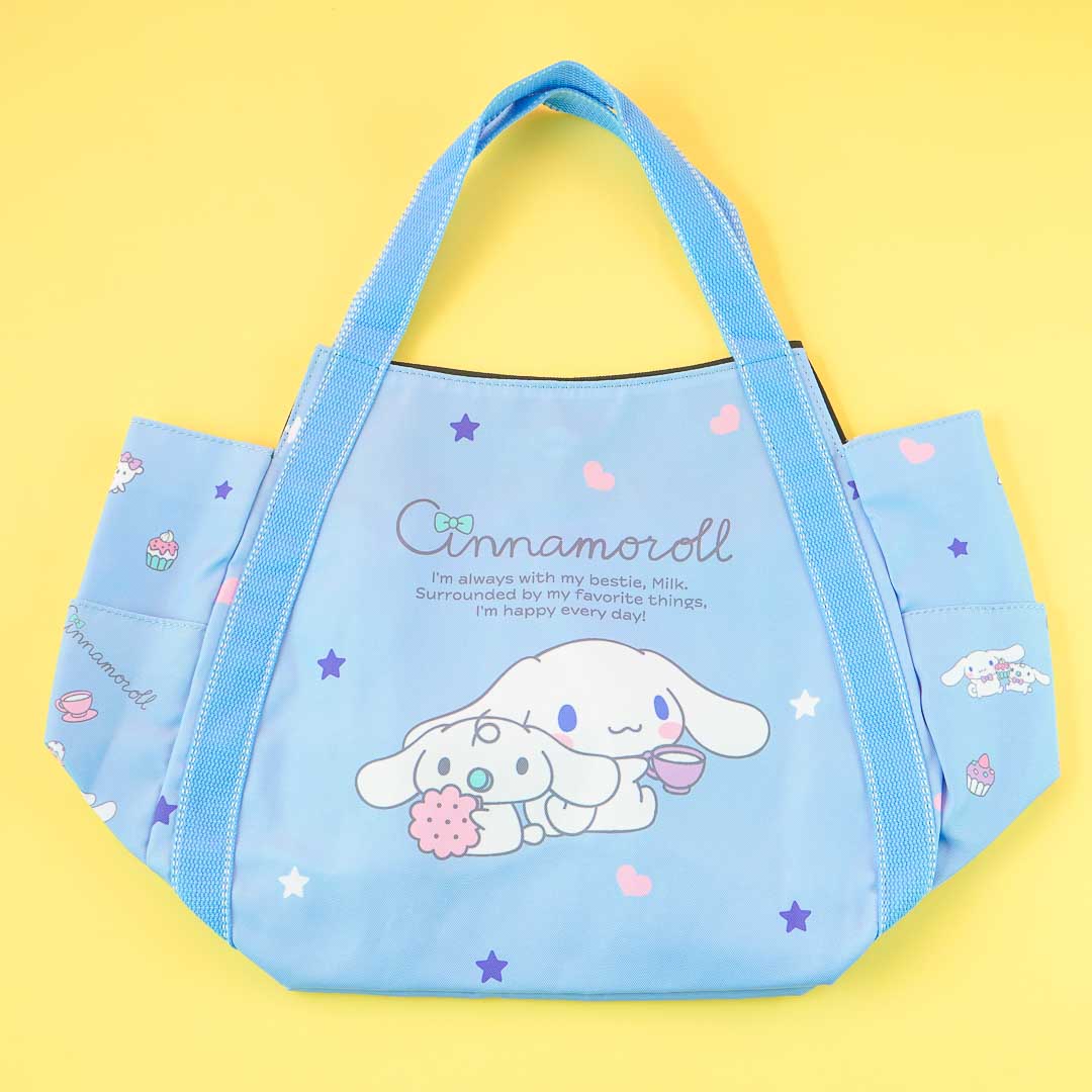 Use this spacious shoulder bag to keep your gym clothes and water bottles! It has outer pockets on each side, a roomy compartment, and an extra inner pocket. This kawaii bag is decorated with an illustration of Cinnamoroll with his puppy pal, Milk!