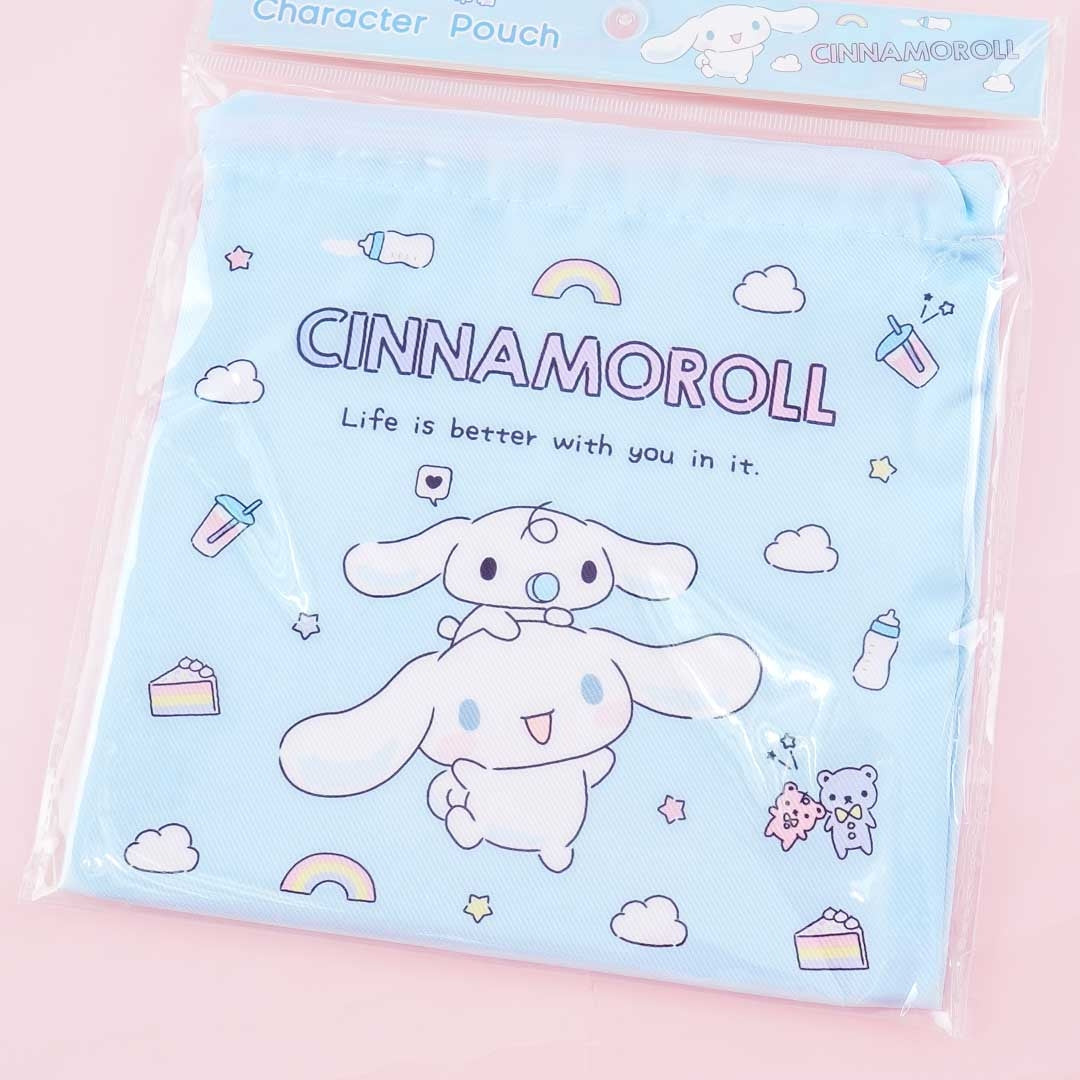 This super kawaii pouch is decorated with prints of Cinnamoroll and his baby friend, Milk — flying together while surrounded with clouds and sweets! You can place your knickknacks inside and simply pull the strings to keep your items secured. It’s made of soft polyester.