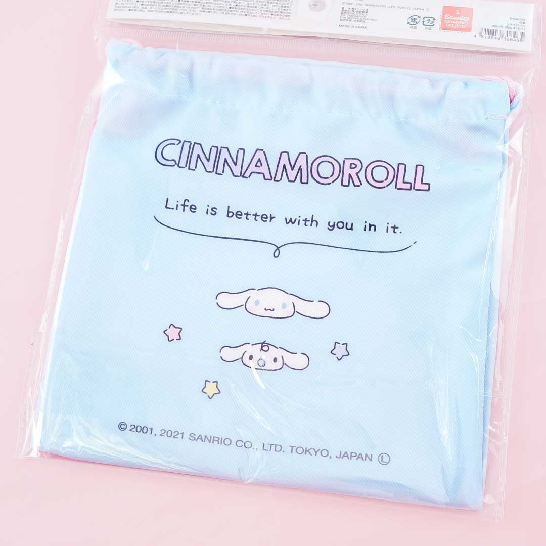 A drawstring pouch featuring Cinnamoroll, Milk, clouds, and desserts