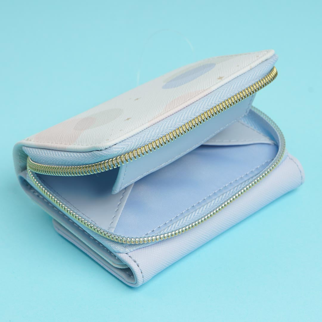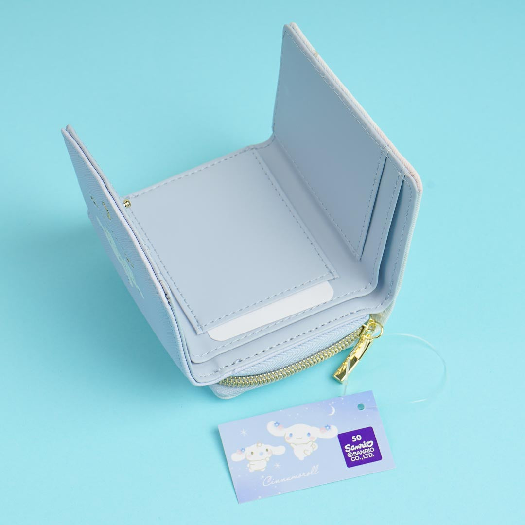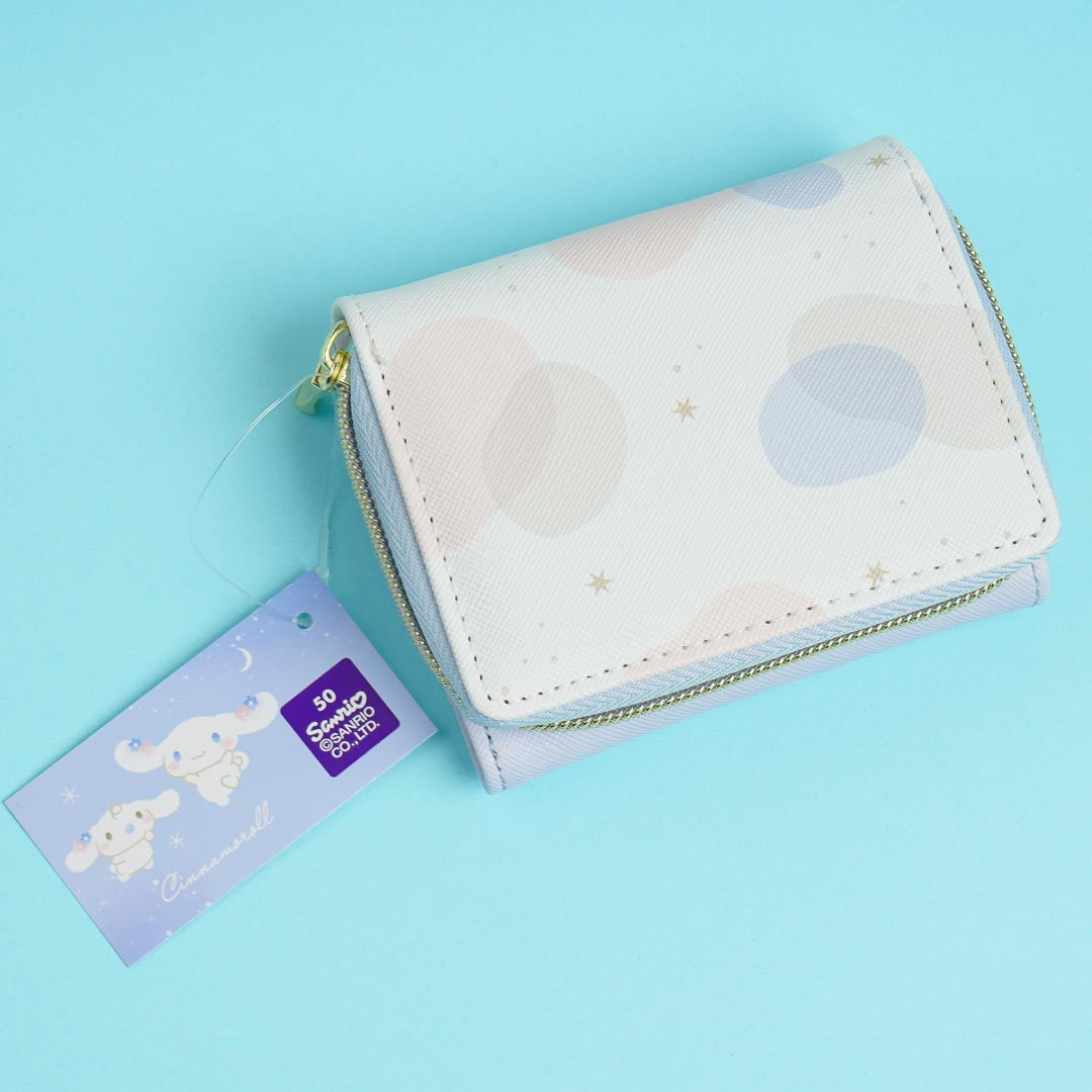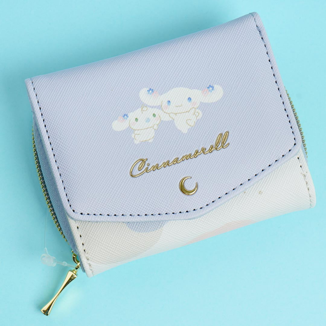 Save up money for some kawaii merch with this cute tri-fold wallet! It features an illustration of Cinnamoroll and Milk with a crescent moon. The wallet has a magnetic snap button so it's easy to open and close.