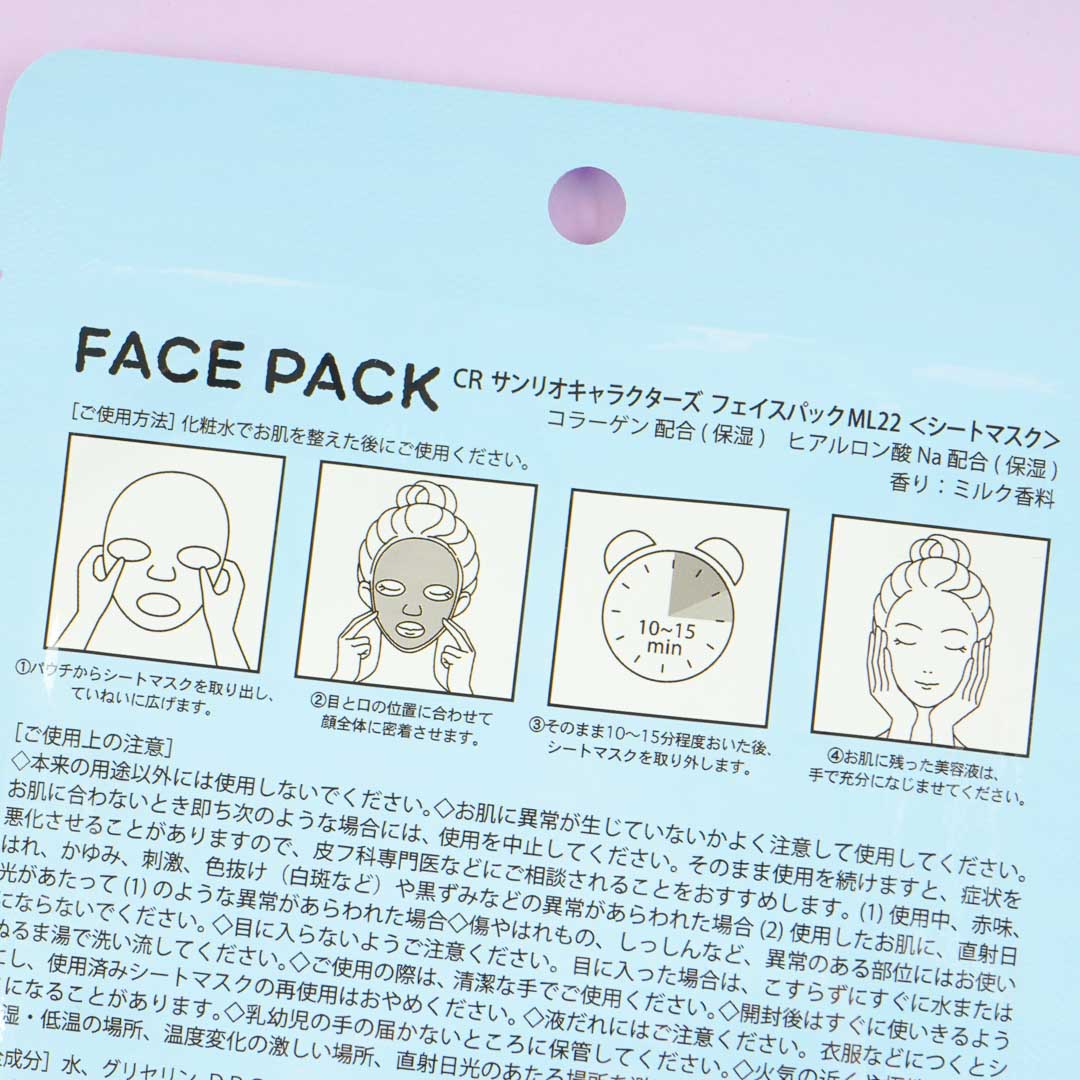 Keep your face feeling smooth by using this face pack sheet mask! It contains beneficial collagen and hyaluronic acid. The sky blue packaging has kawaii illustrations of besties Cinnamoroll and Milk.