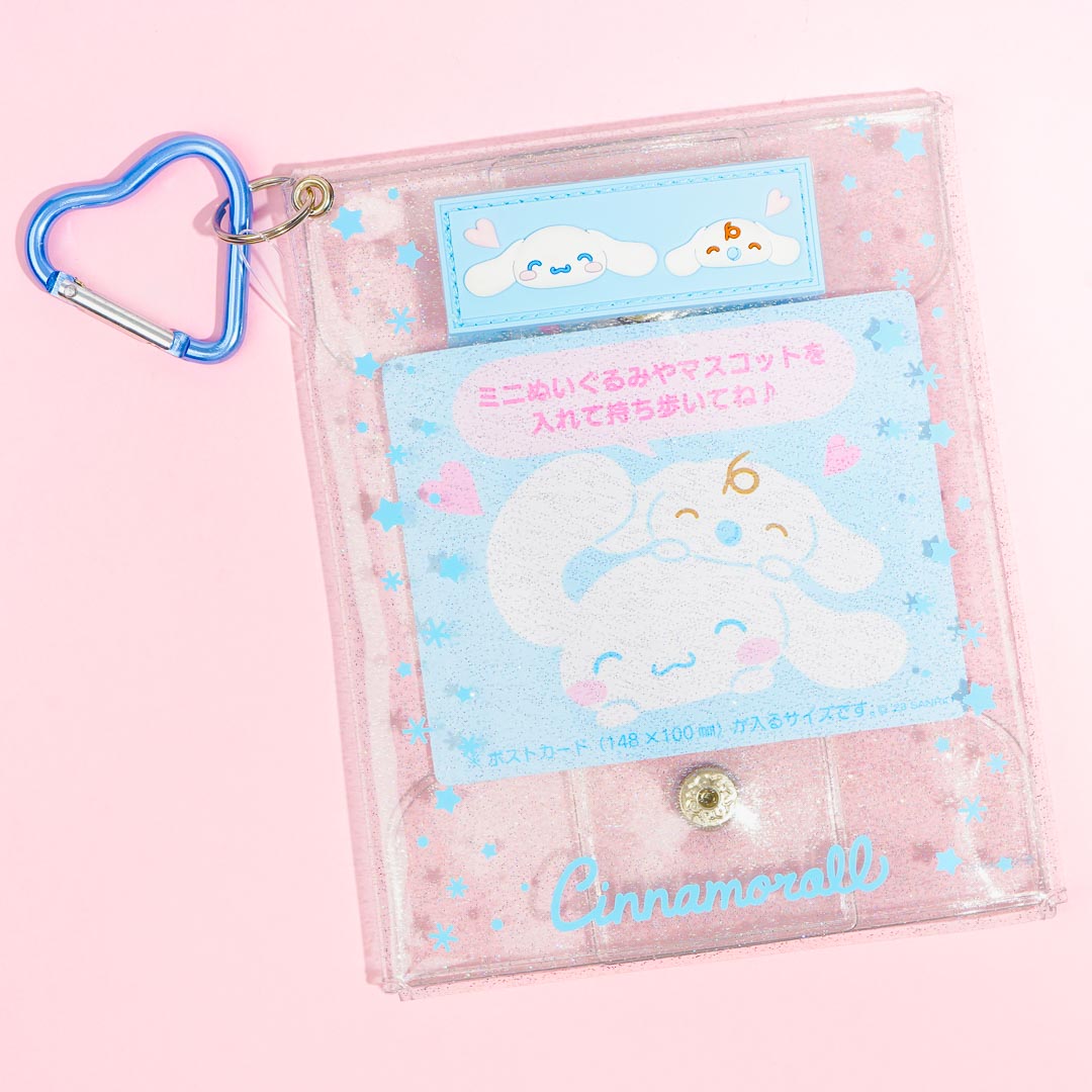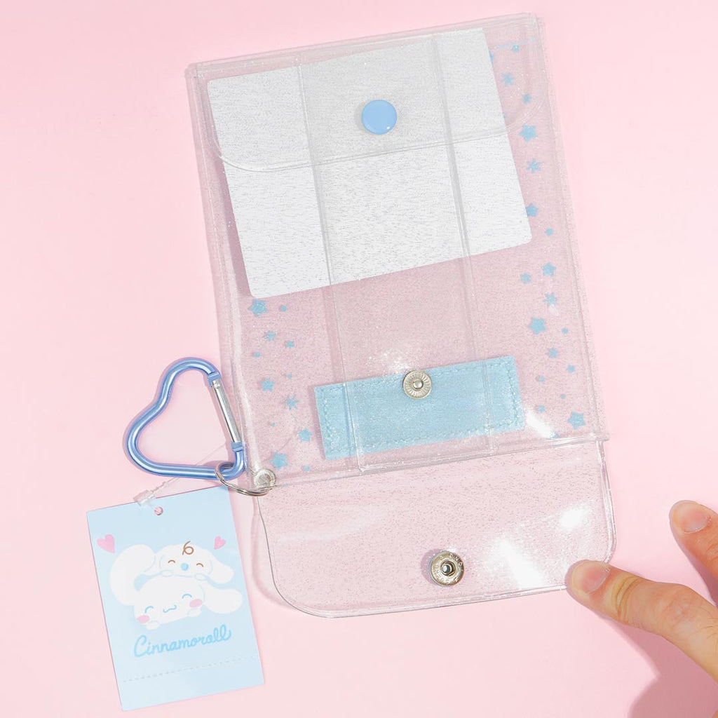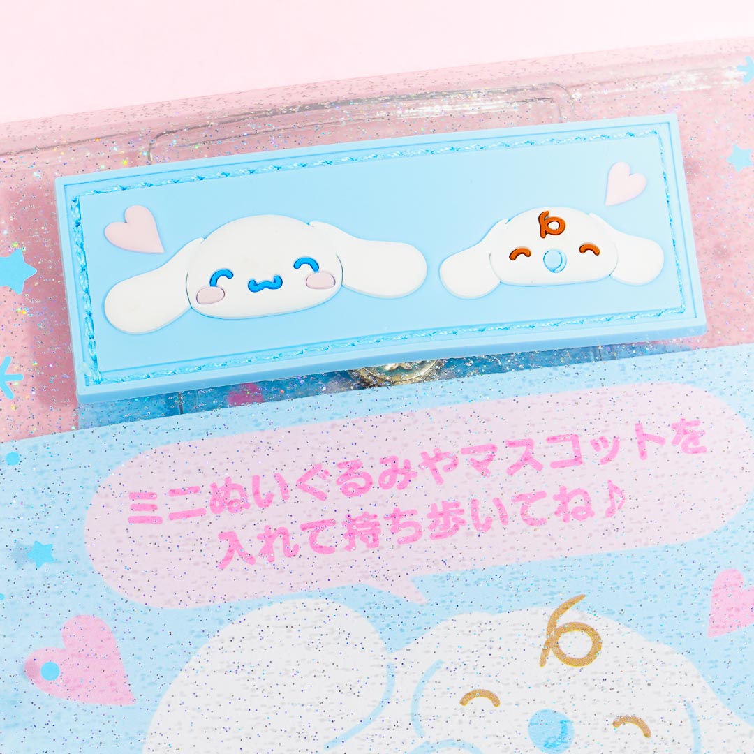 This kawaii clear pouch showcases the cute smiling faces of Cinnamoroll and Milk! It's a plastic glittery pouch with snap-button closures on both ends. You can attach this to your bag using the heart-shaped metal carabiner.