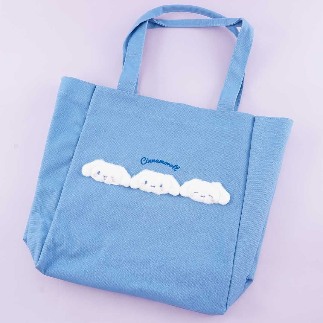 A cute tote bag that has fluffy Cinnamoroll heads with different facial expressions