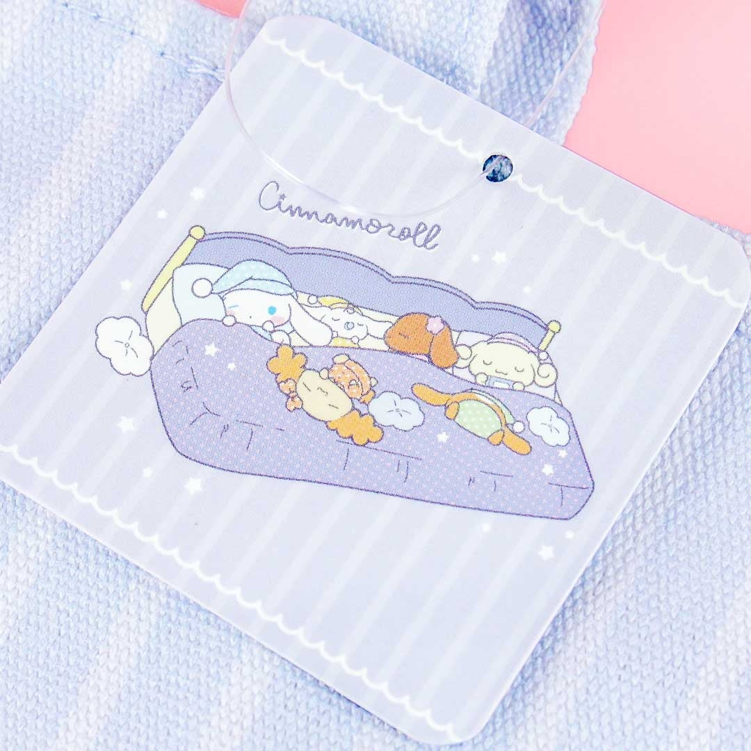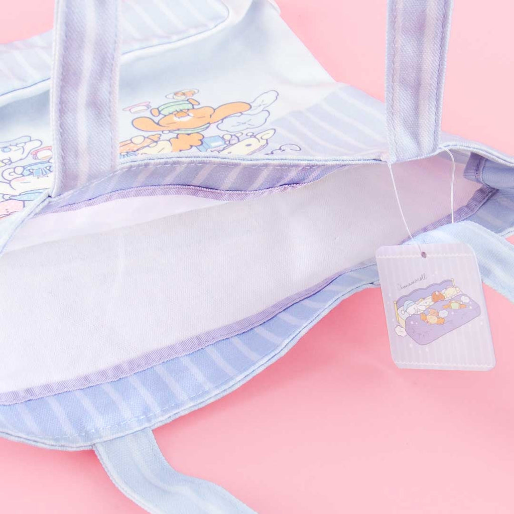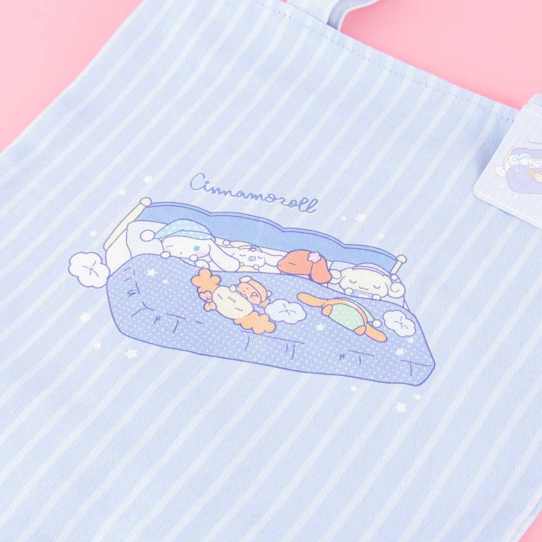 • A striped tote bag featuring Cinnamoroll and his friends on a sleepover