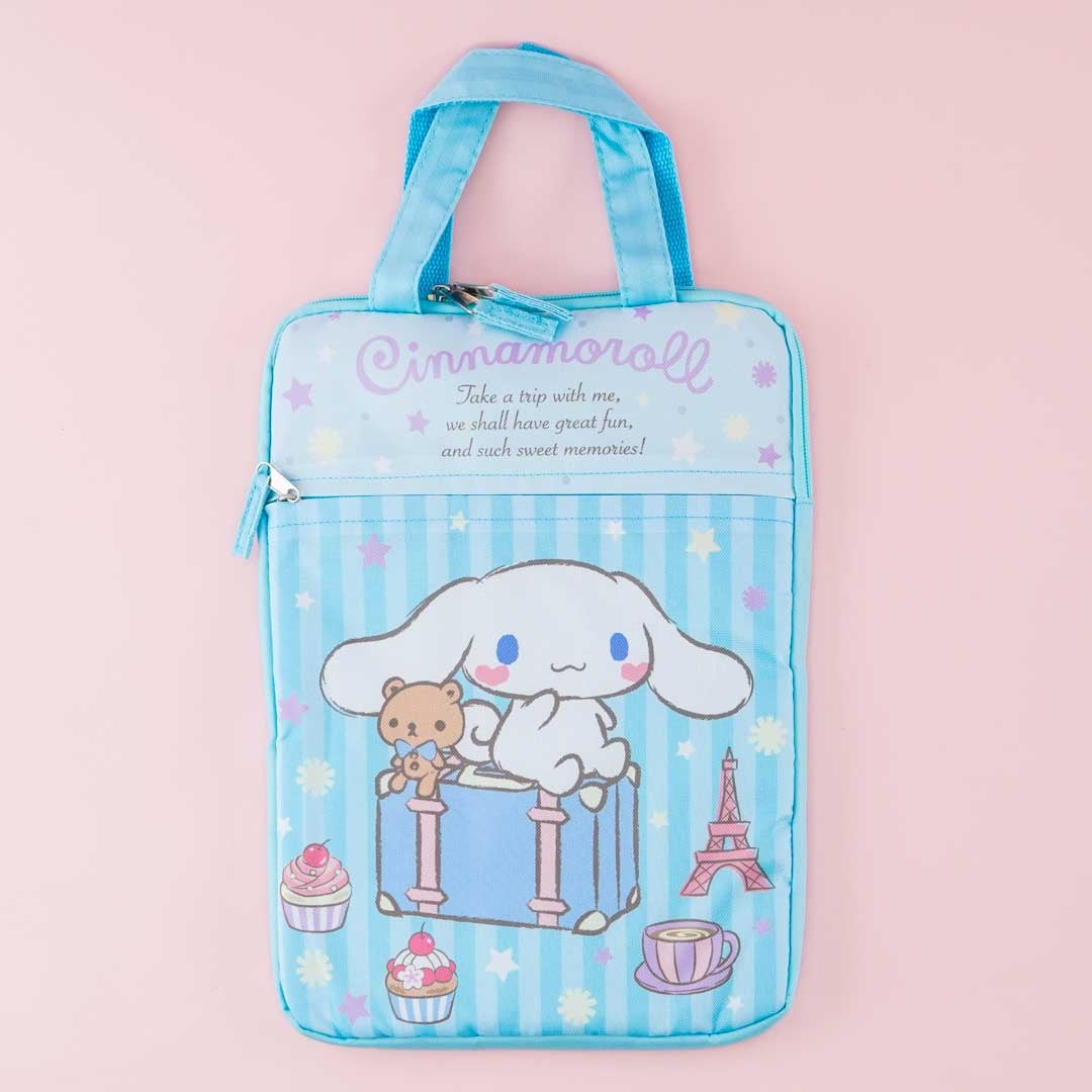 This super cute gadget bag features a print of Cinnamoroll getting ready to go on a trip to Paris. It has a zipper closure, a zippered front pocket, and inner cushioning to help keep your things safe. Use it to bring along your laptop or tablet!