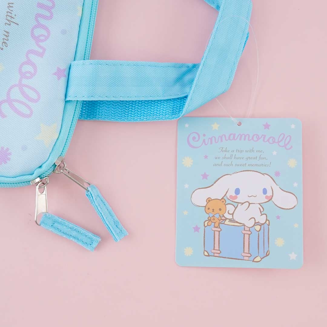 A kawaii zippered gadget bag illustrated with Cinnamoroll getting ready for a Paris trip