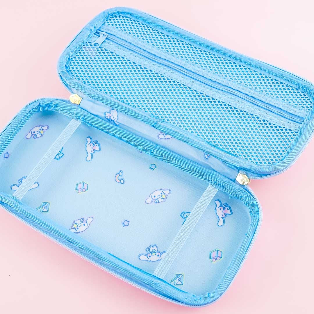 A kawaii game console hard pouch illustrated with Cinnamoroll carrying around party things