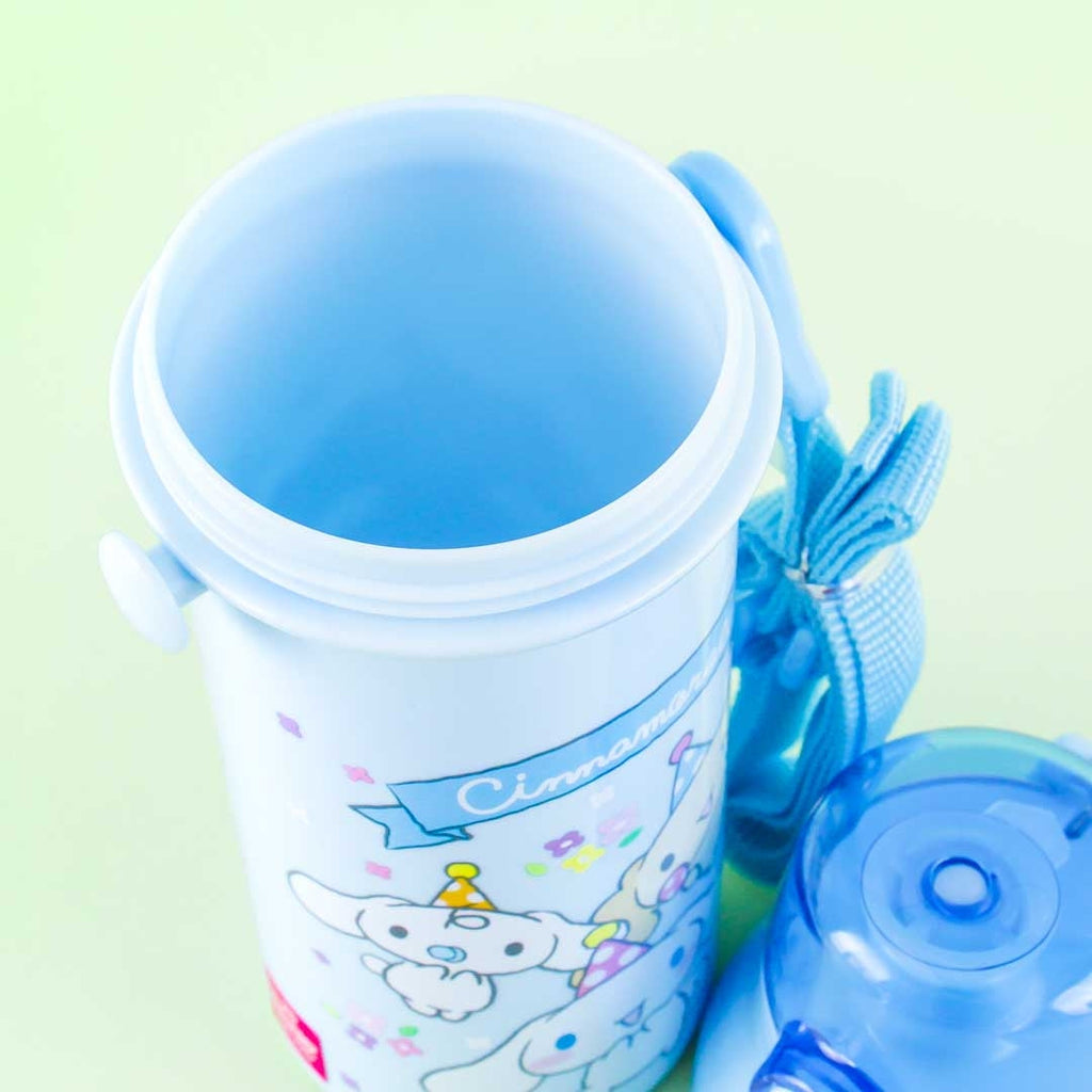 Take along your favorite drink with this super cute water bottle illustrated with Cinnamoroll characters at a party! It has a twist lid with a snap-on lock that prevents spillage. Carry the bottle around comfortably with its adjustable and removable strap.