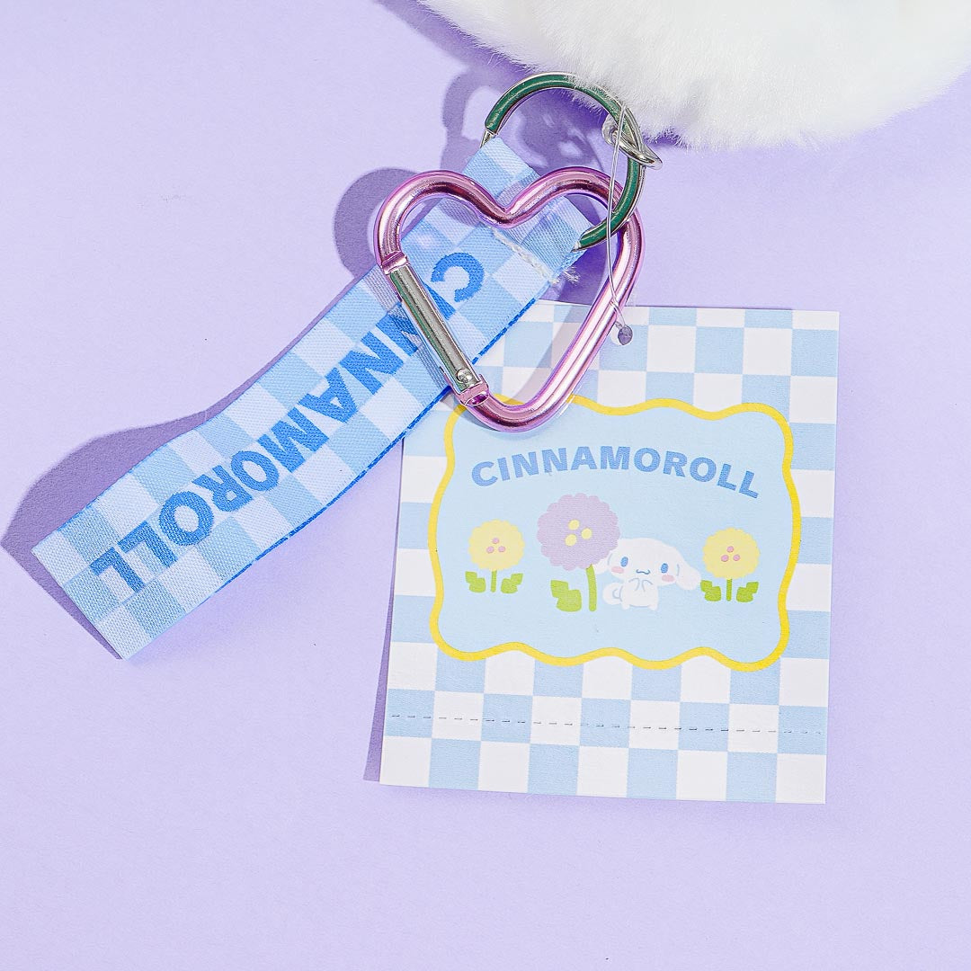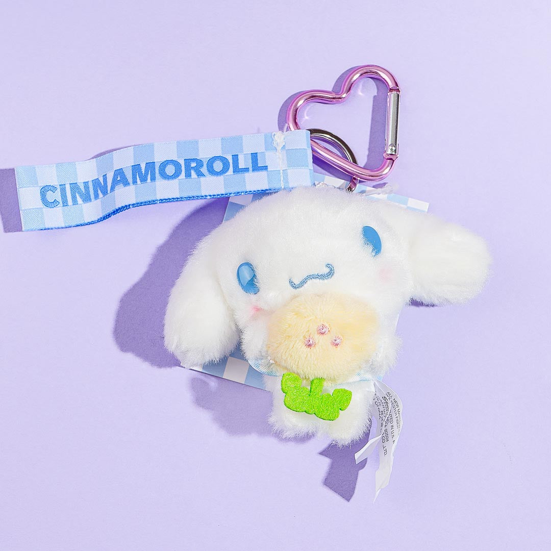 Kawaii-fy your purse or backpack with this cute Cinnamoroll mini plush charm! It features a fluffy yellow flower and a cute checkered design. You can easily attach it to your bag using the heart-shaped metal carabiner!