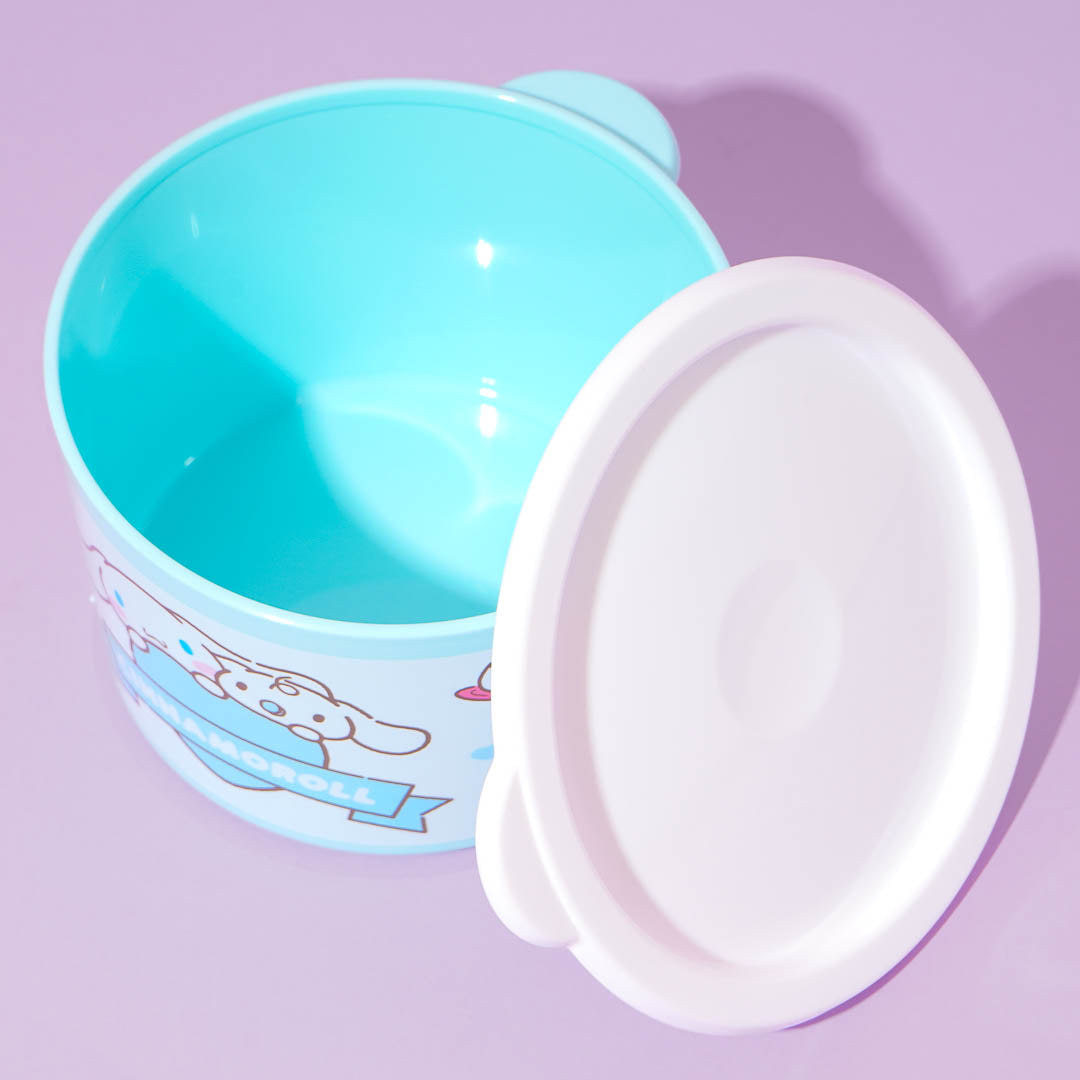 Use this super cute airtight container to store food. This round container showcases a print of Cinnamoroll playing with his buddy, Milk. Press the center of the lid to open the container!