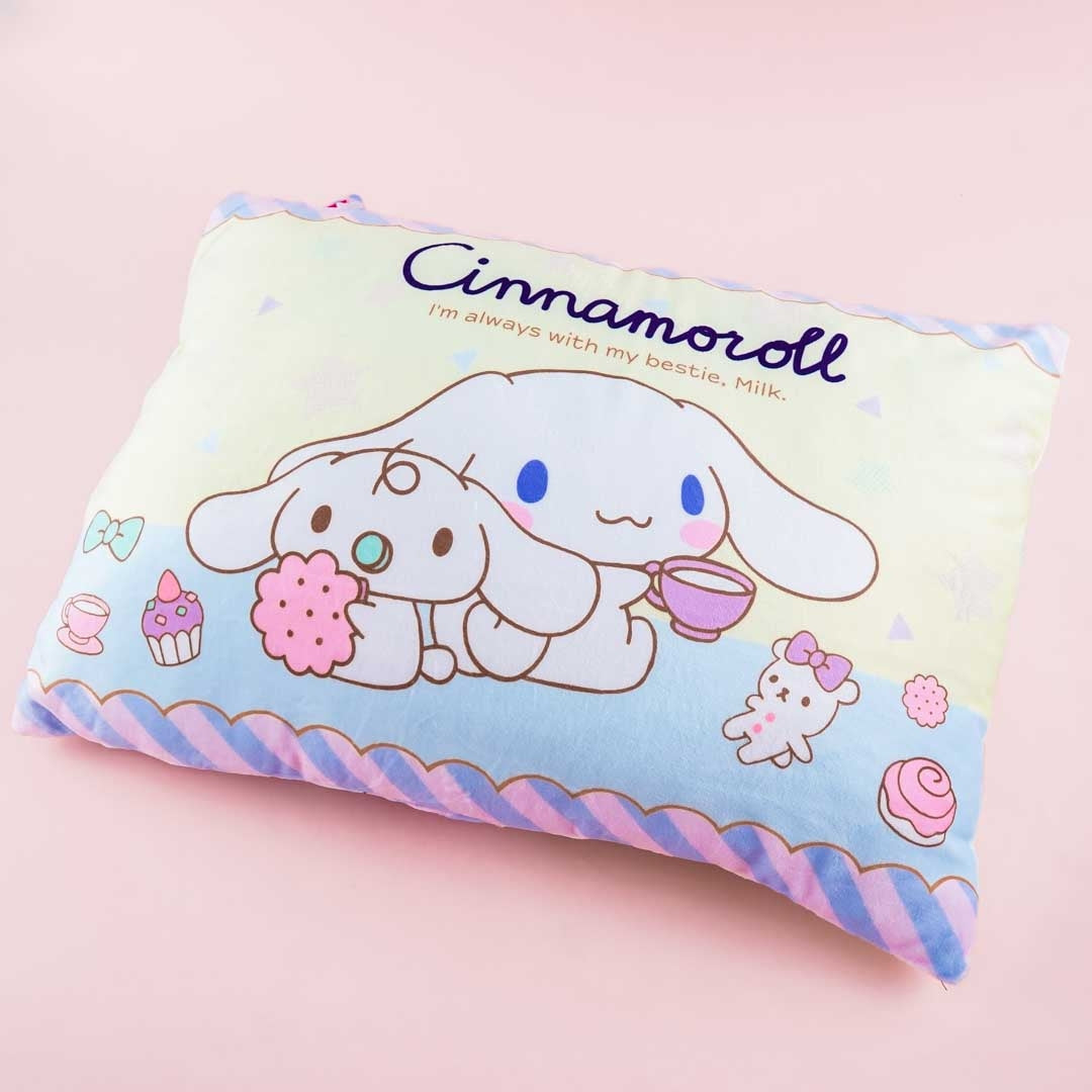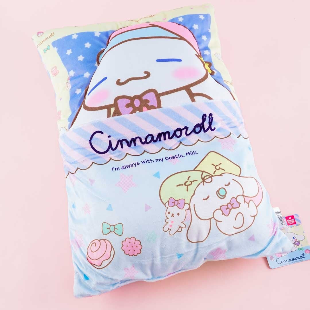 Use this super cute cushion to kawaii-fy to your desk setup! The front features prints of Cinnamoroll hanging out with Milk while the back showcases the Sanrio puppy sleeping. It comes from the popular Sanrio series, "Plump Good Night Cushion."