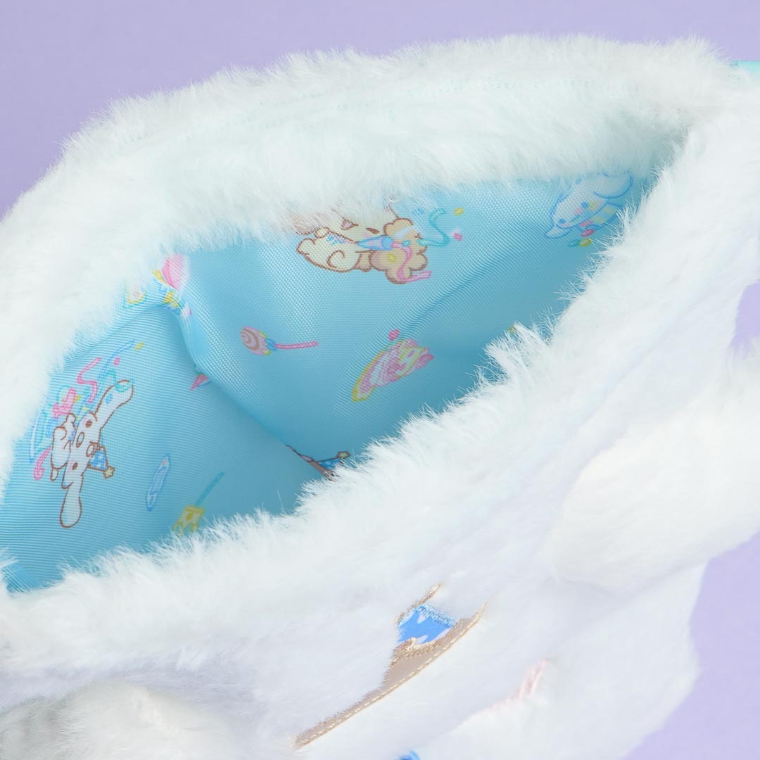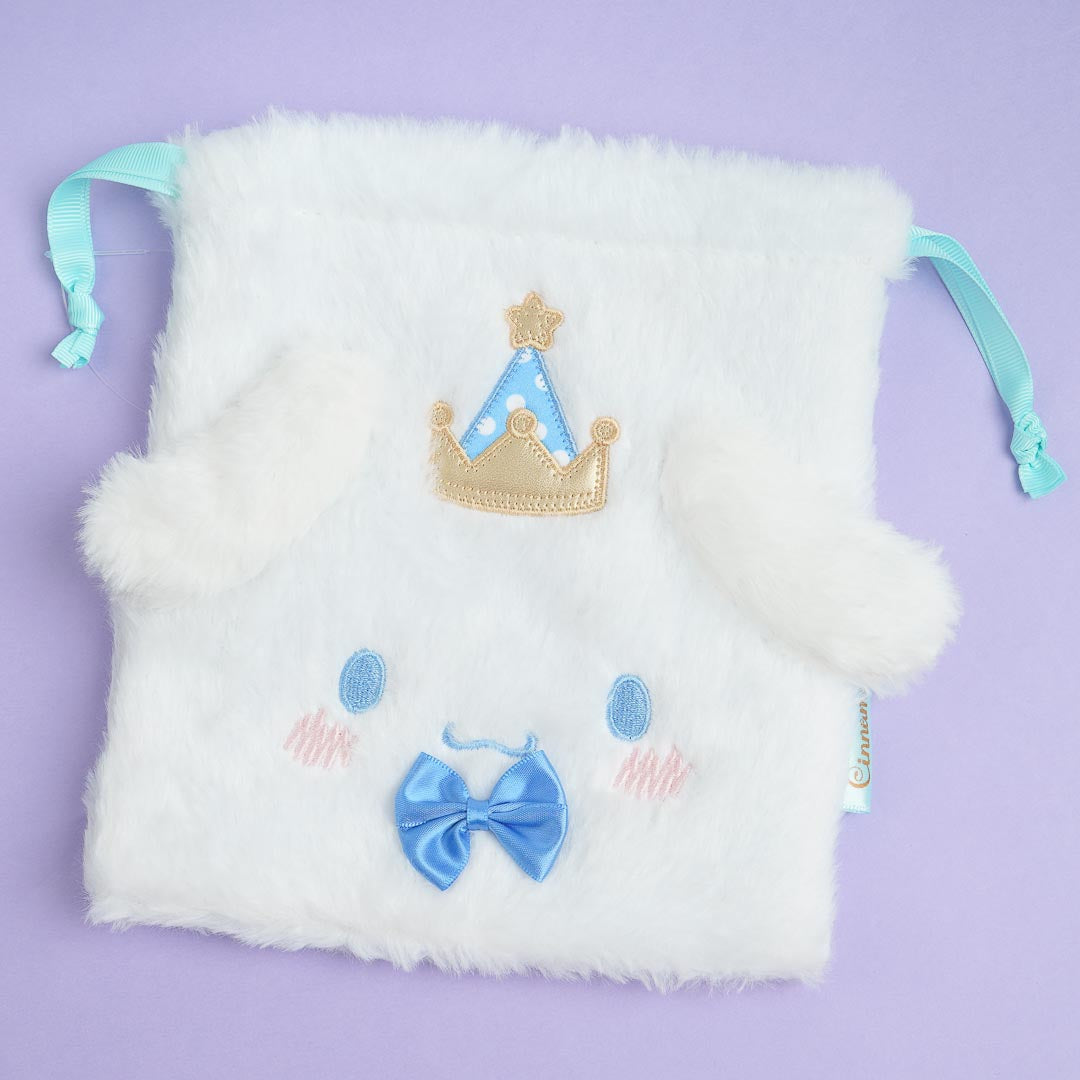 This kawaii fluffy drawstring bag is great for carrying around jewelry or some sweet treats! It's illustrated with Cinnamoroll's face with a crown and pop-out ears. Just pull the strings to close the bag.