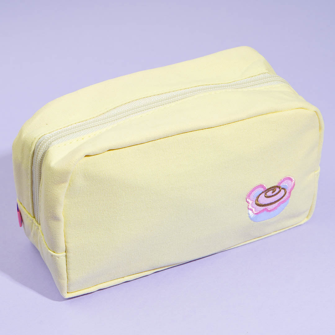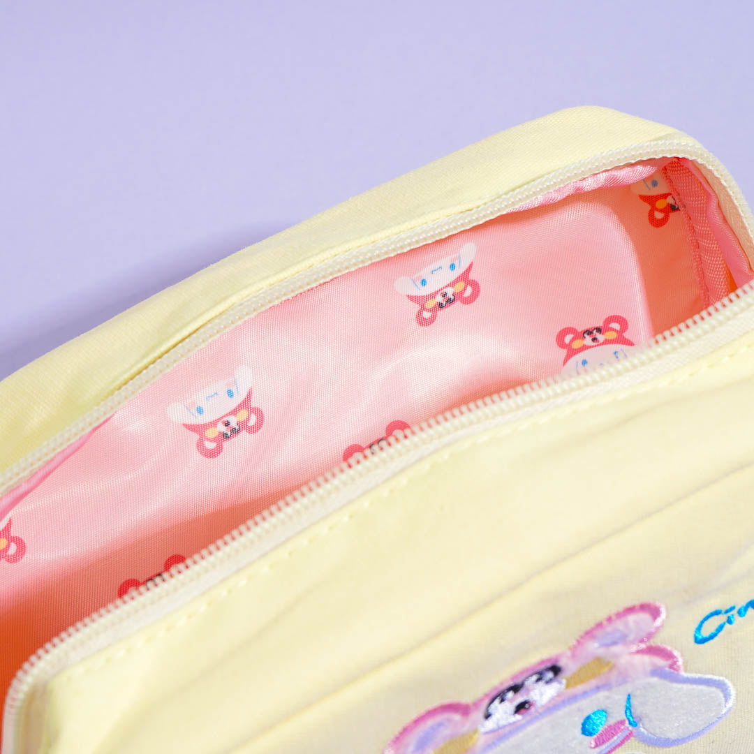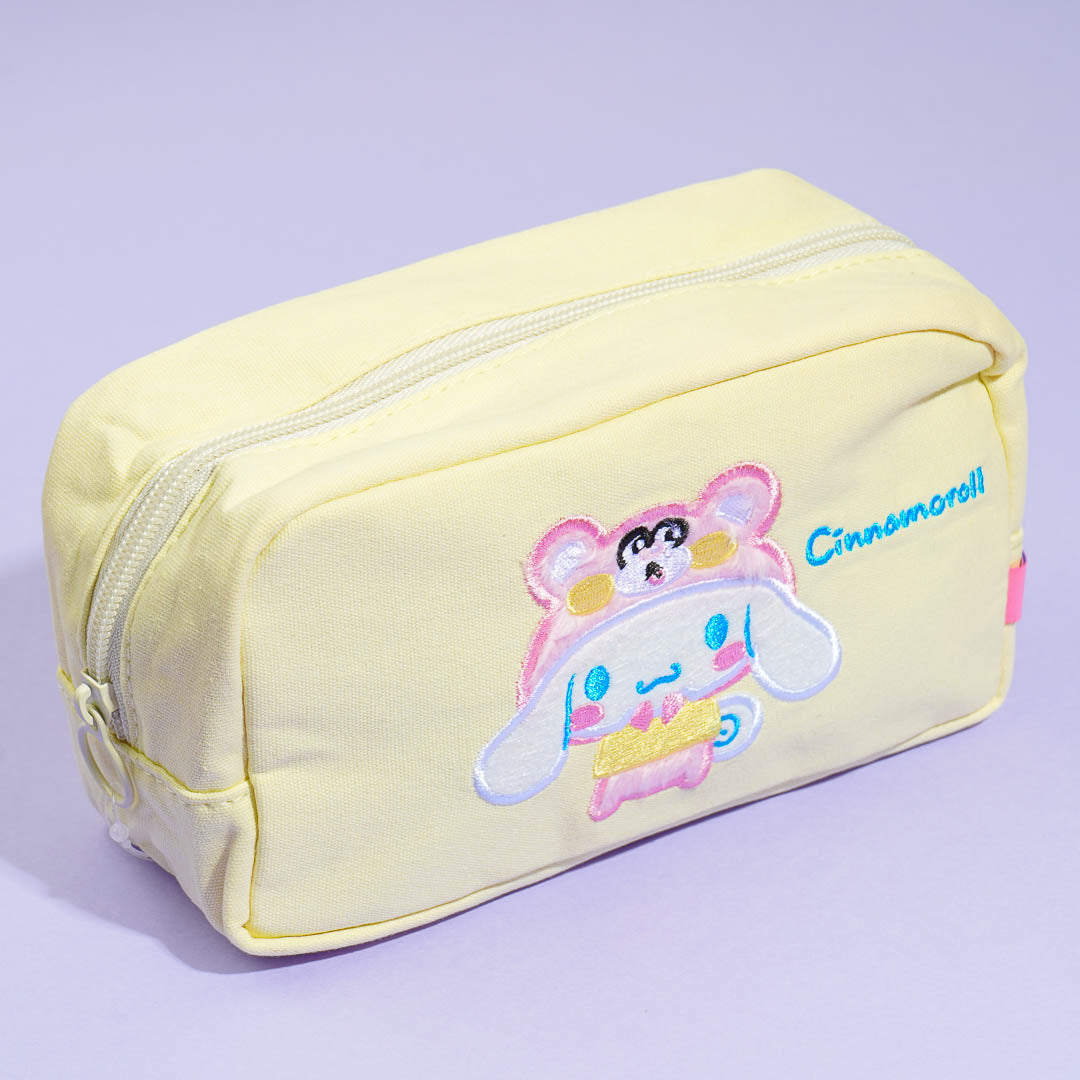 Use this cute pencil case to bring along your special markers, pens, and more to school. It features an embroidered print of Cinnamoroll wearing a silly bear outfit!