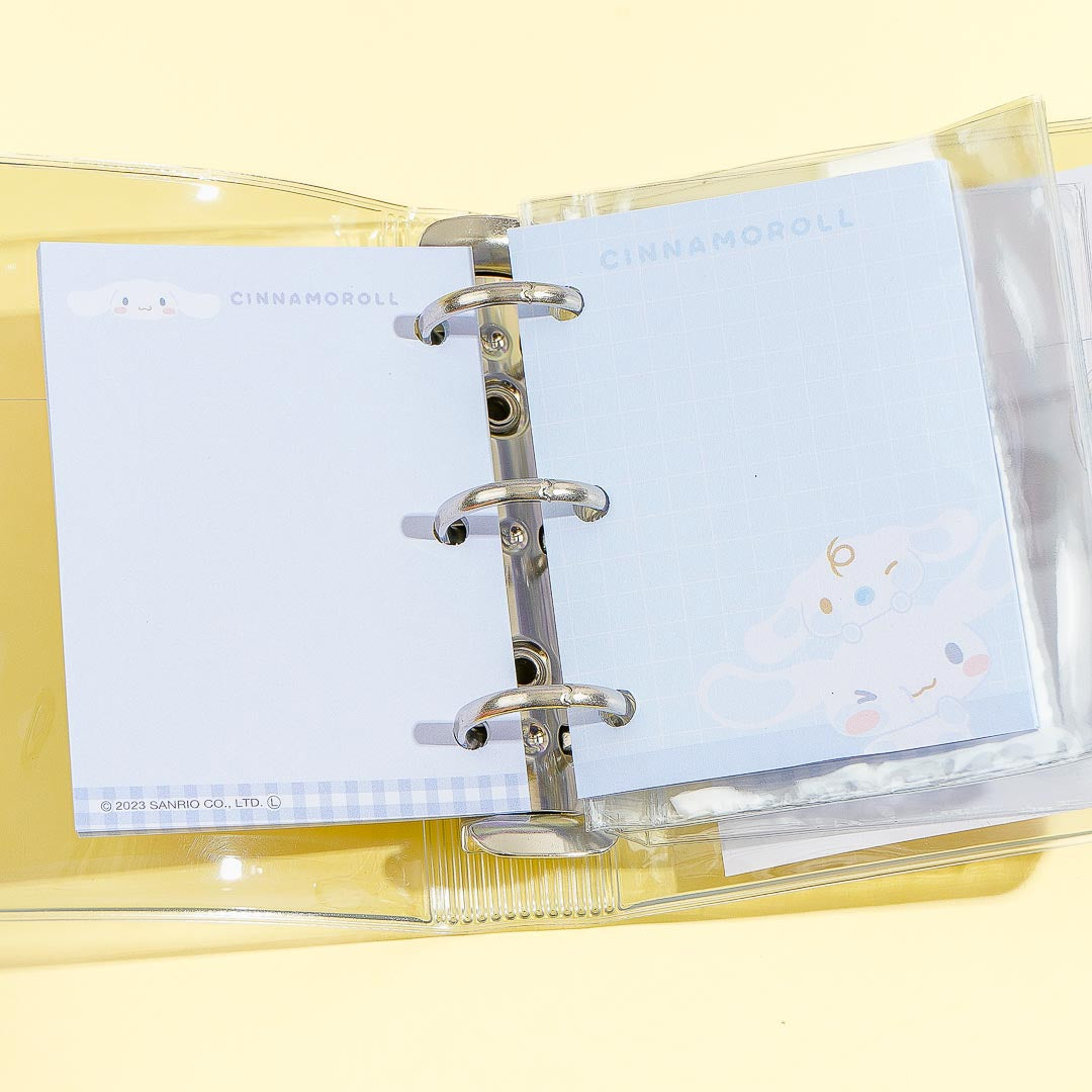 Use this kawaii mini binder notebook to scribble down notes. It has a print of Cinnamoroll and his buddy Milk squishing their faces! This notebook has a plastic cover with a button closure.
