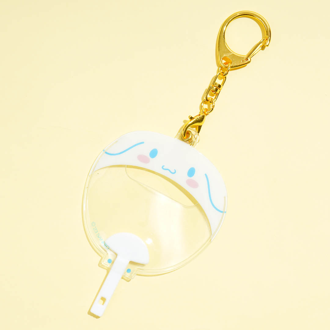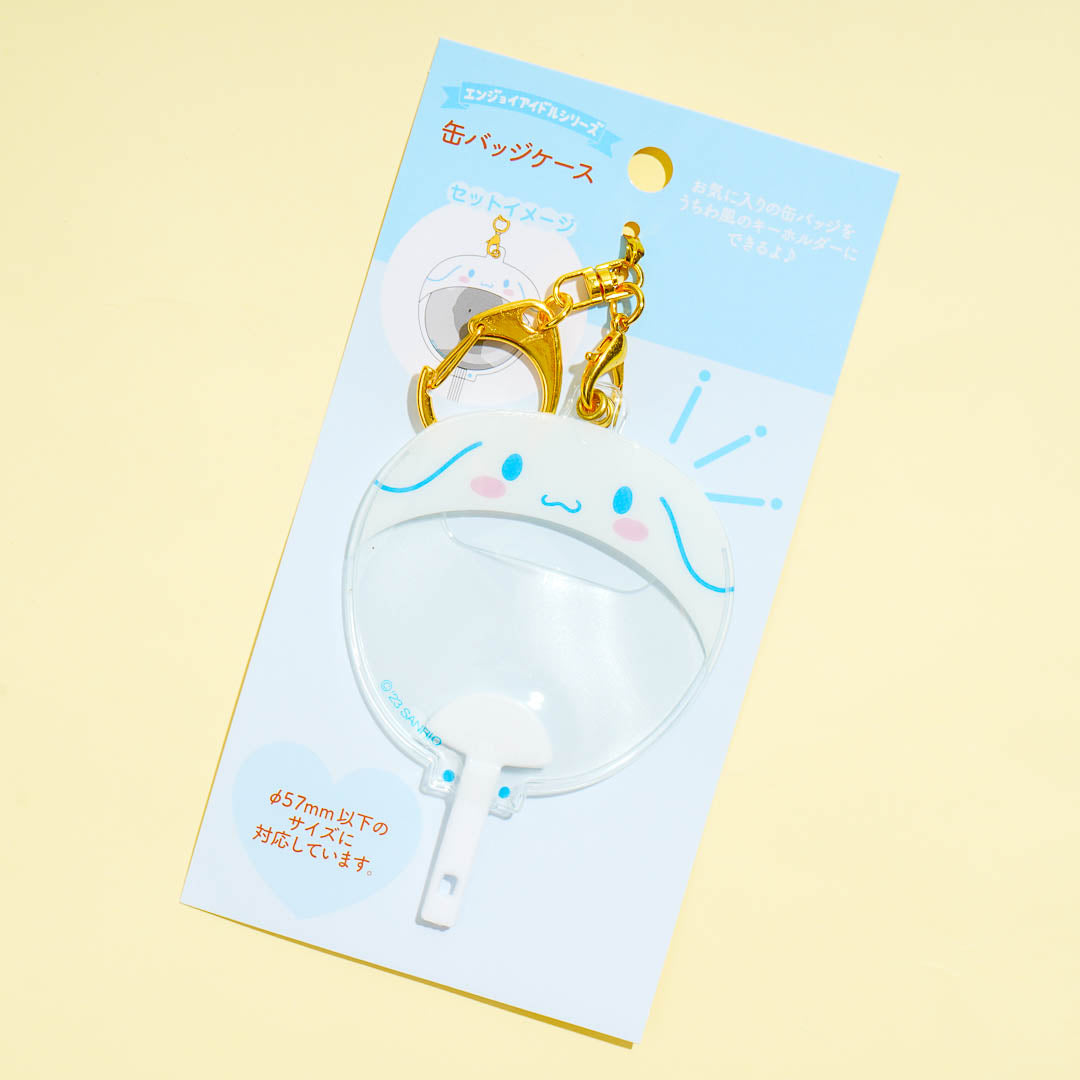 Keep your favorite can badge inside this super cute case that doubles as a keychain! It features Cinnamoroll shaped like an uchiwa fan and a removable metal hook.
