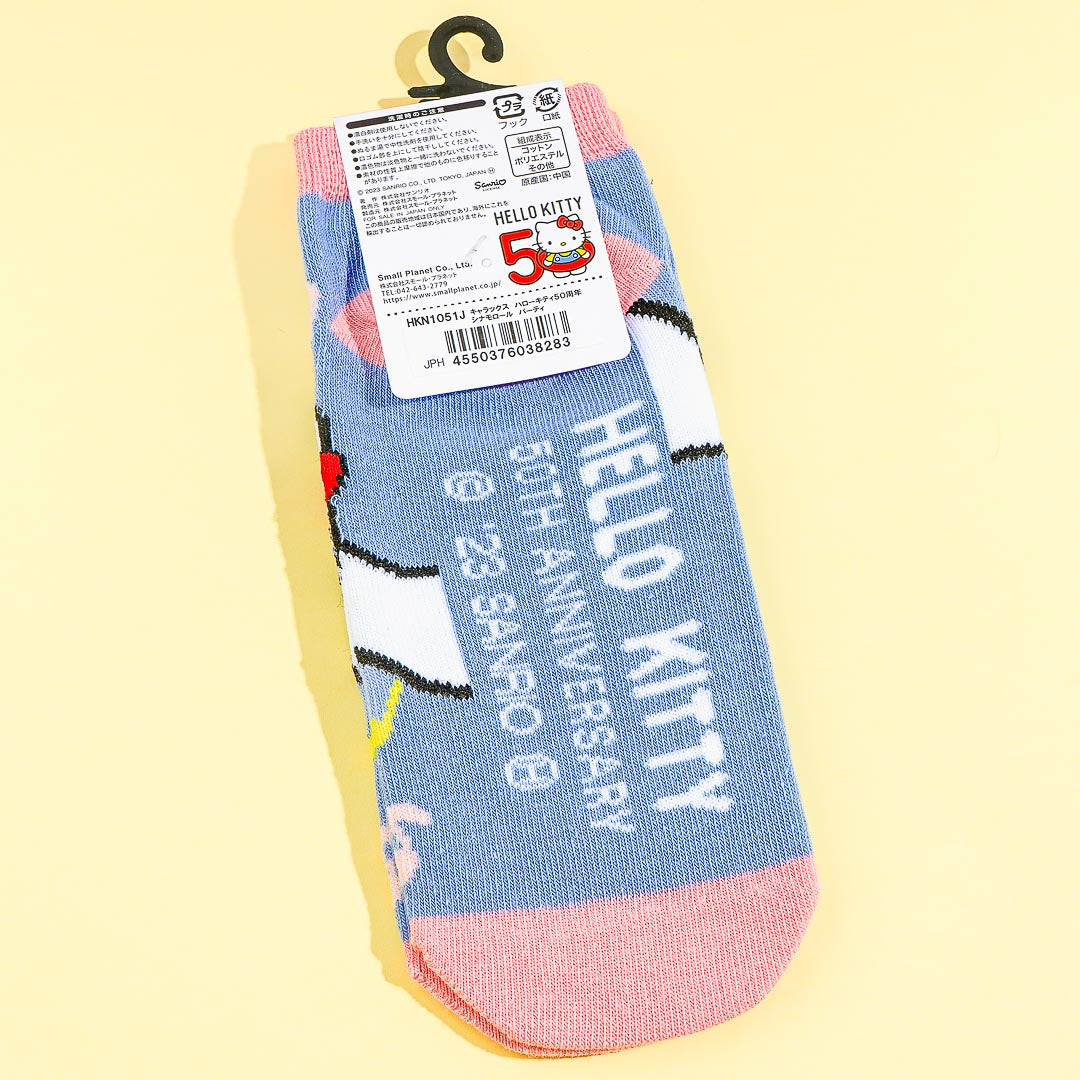 Keep your feet warm and comfy by wearing this kawaii pair of socks! It features a cute print of Cinnamoroll dressed as Hello Kitty.