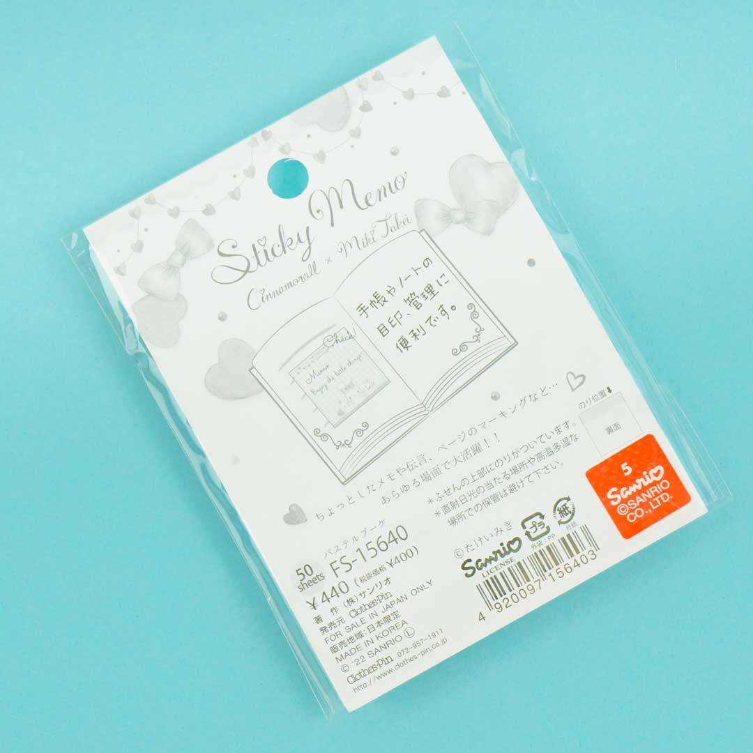 The sticky note sheets are decorated with illustrations of Cinnamoroll pretending to be a bunny while surrounded by blooms and rabbits! Use these sticky notes to write quick reminders! The cute design was created by Japanese illustrator, Miki Takei.