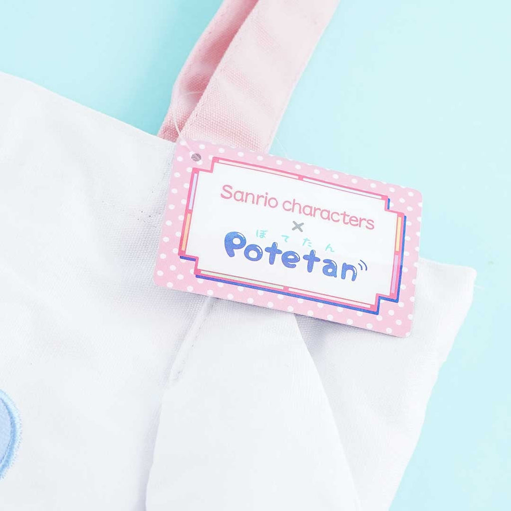 A cute Cinnamoroll tote bag with a die-cut design resembling a Potetan animal plushie