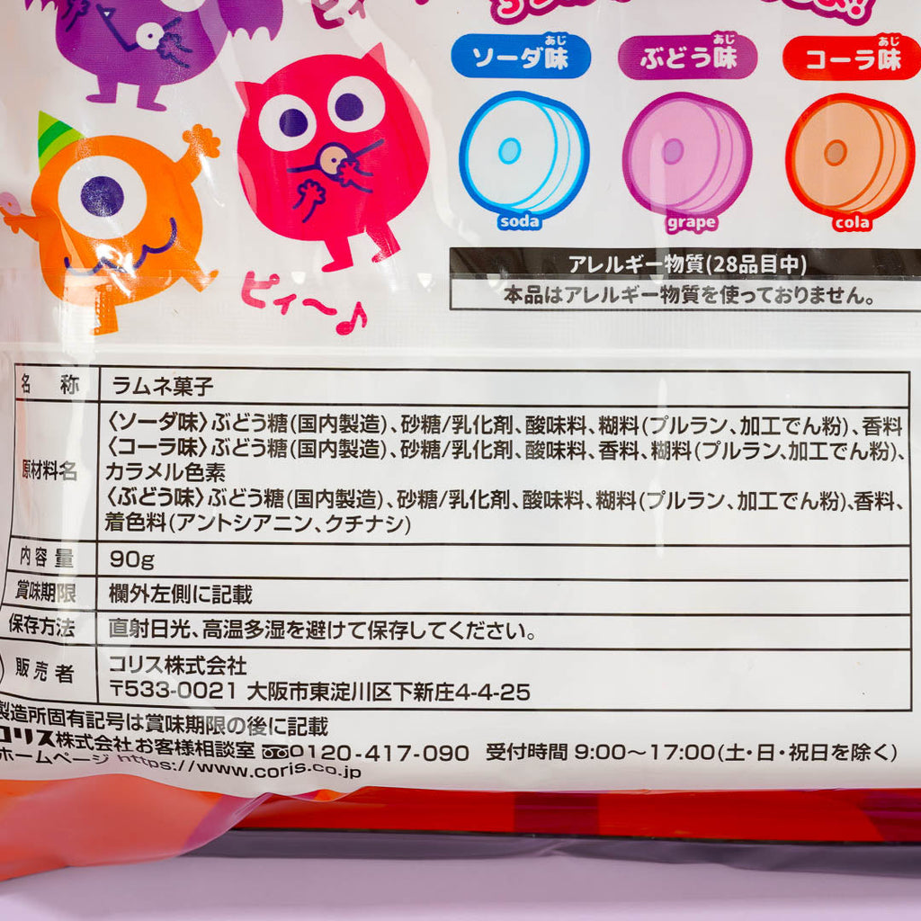 Ramune is a popular carbonated soft drink in Japan. Now you can have a taste of ramune with this Halloween-themed pack of candy! There are three different ramune flavors for you to enjoy - soda, cola, and grape. Give some away to nice trick-or-treaters during All Hallow's Eve.