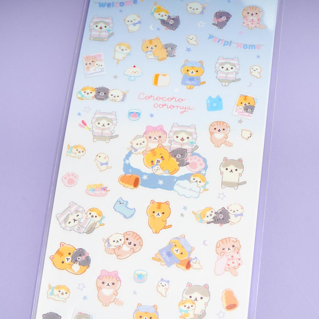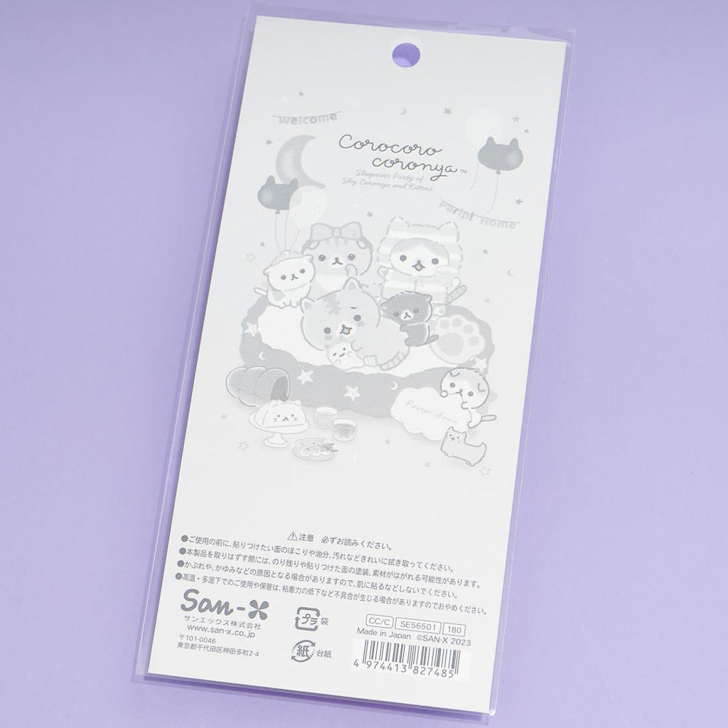 Jazz up your notebook covers by decorating them with these kawaii transparent stickers! This sheet has die-cut designs featuring illustrations of the cute Corocoro Coronya characters having a fun sleepover party.