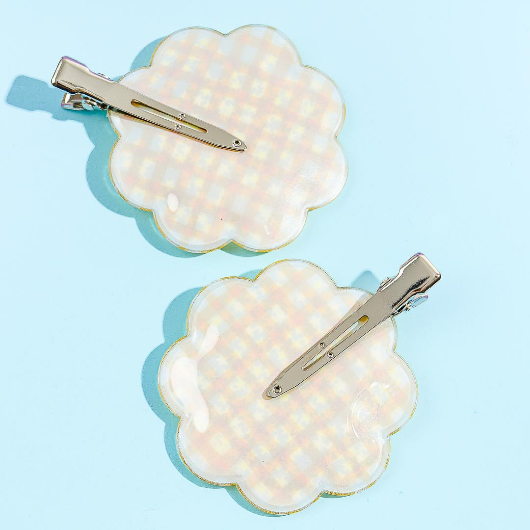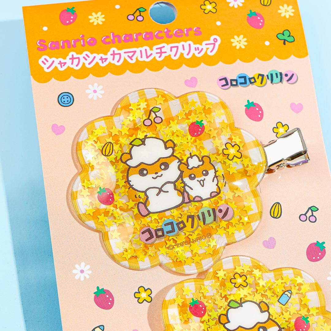 Add a dose of cuteness to your hairstyle using these super cute hair clips! They feature cute prints of Corocorokuririn on a gingham pattern. Each metal clip is filled with star-shaped glitter that shakes and makes a "shaka shaka" sound!