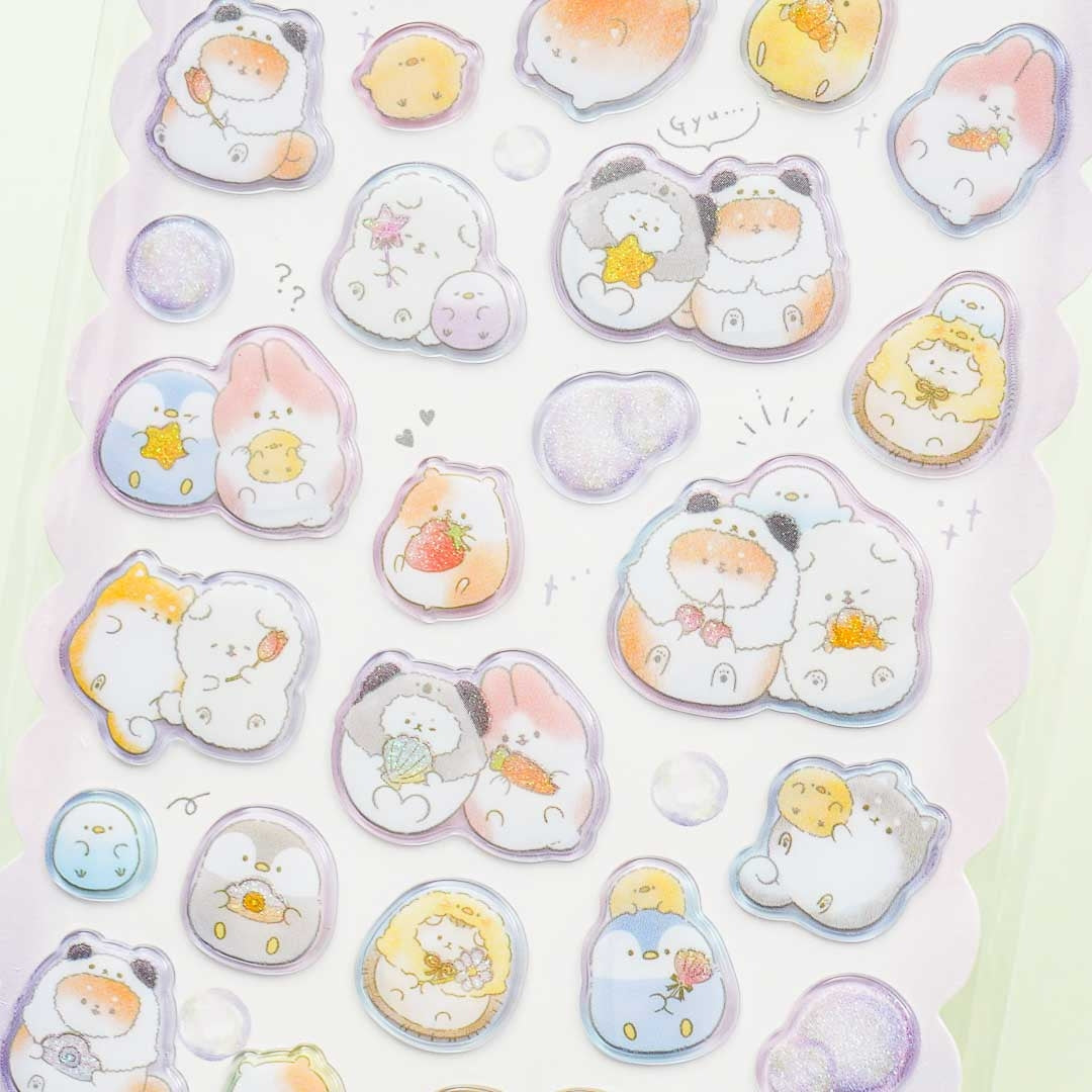 • A kawaii sheet of transparent stickers showcasing animal friends cuddling