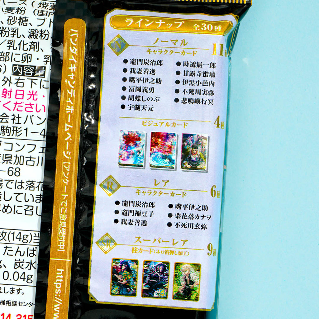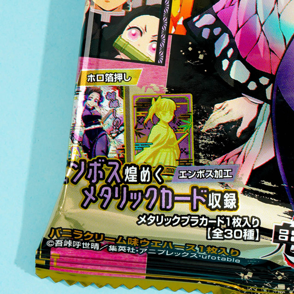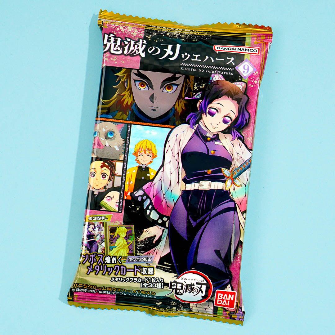 This vanilla cream wafer pack features prints of characters from the popular anime series, Demon Slayer. Snack on it while watching your favorite anime! It comes with a collectible Demon Slayer card. Surprise yourself with a random card from a set of 30 different designs when you order.