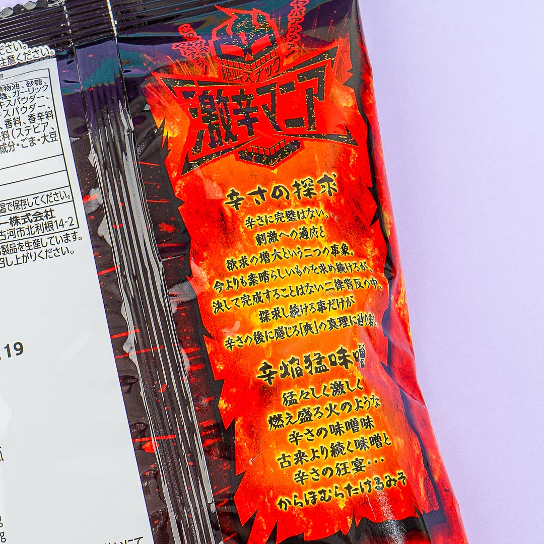 Satisfy your curiosity by trying out these super spicy corn sticks! These crunchy snacks are generously coated with a fiery powder that tastes like a combination of chili peppers and savory miso paste.