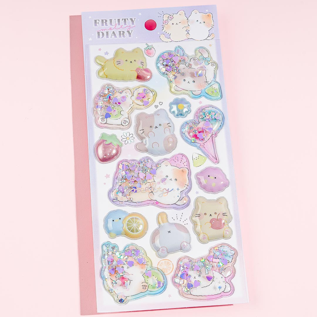 These super cute and puffy stickers have moving glitters inside when you shake them! It features illustrations of fluffy cats having fun over sweets! Use this kawaii die-cut set to decorate your photo albums and scrapbooks.