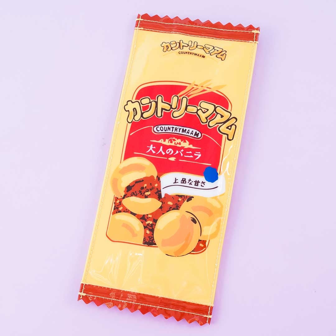 • A kawaii zippered pouch featuring a print of the packaging design of Fujiya Country Maam cookies