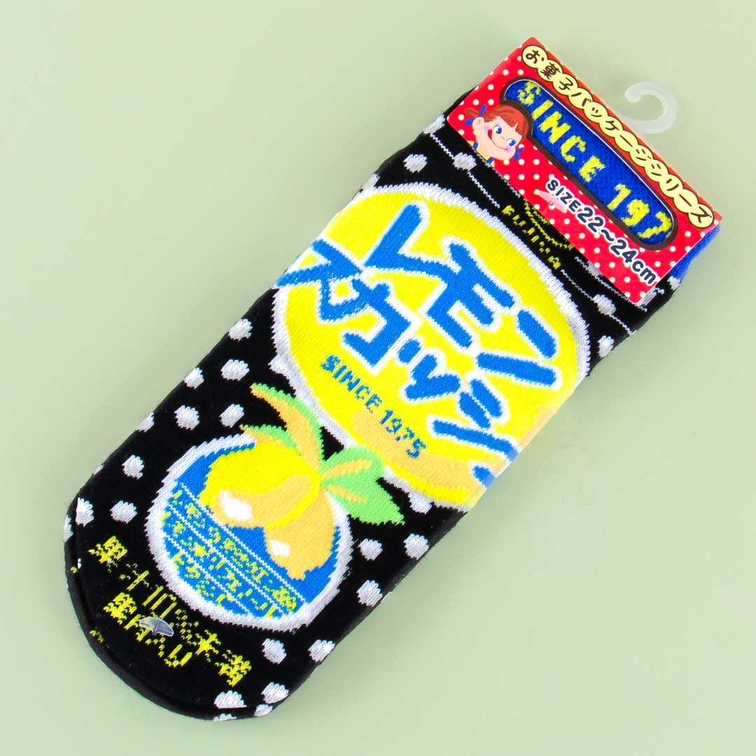 Add a touch of kawaii to your outfit by wearing these cute socks! It’s made of soft cotton material and resembles the polka-dotted packaging of Fujiya’s Lemon Squash candy.