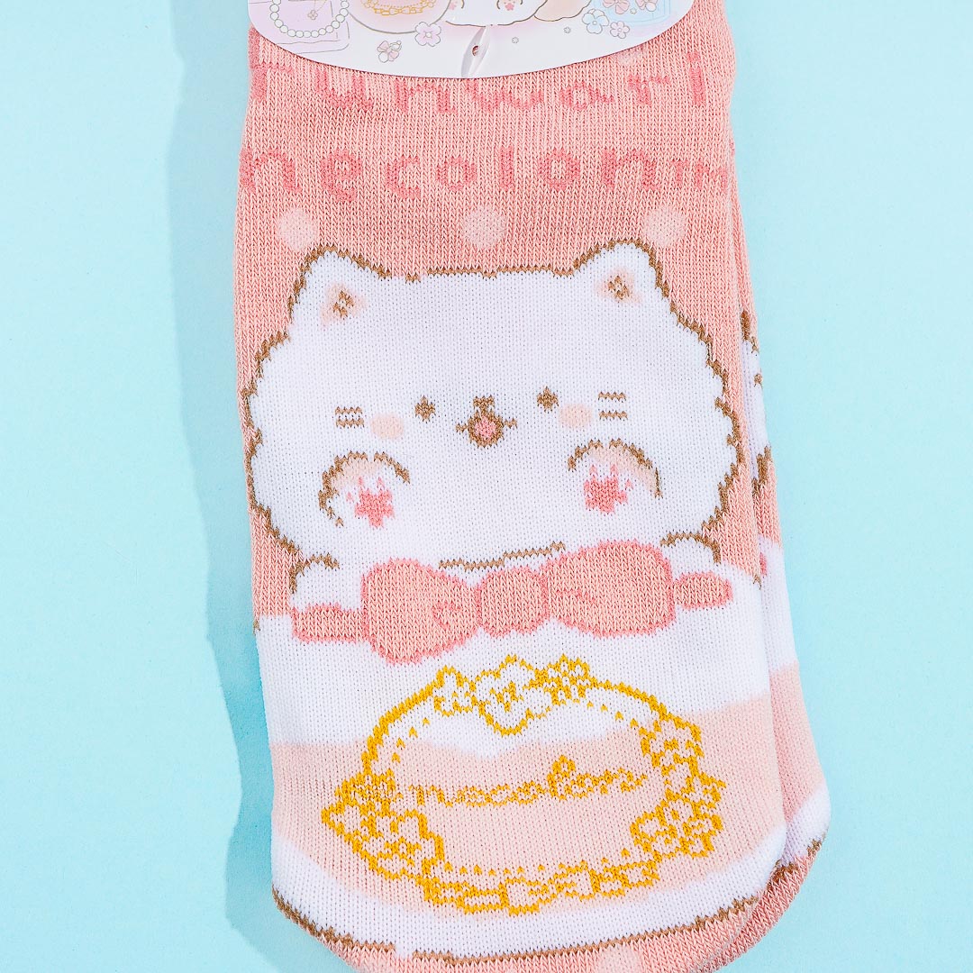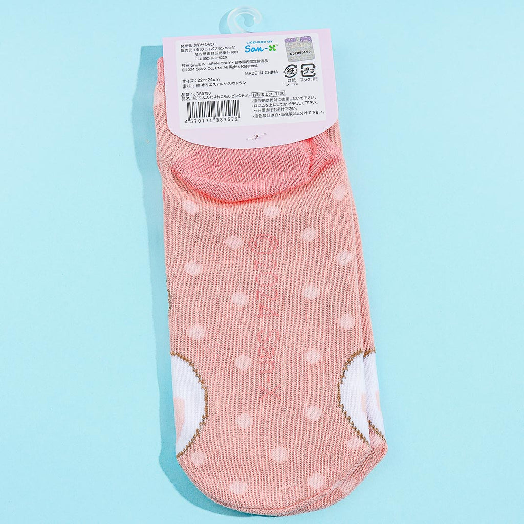 Wear this kawaii pair of socks at your next slumber party! It features a cute print of Funwari Nekolon with a polka dot pattern.
