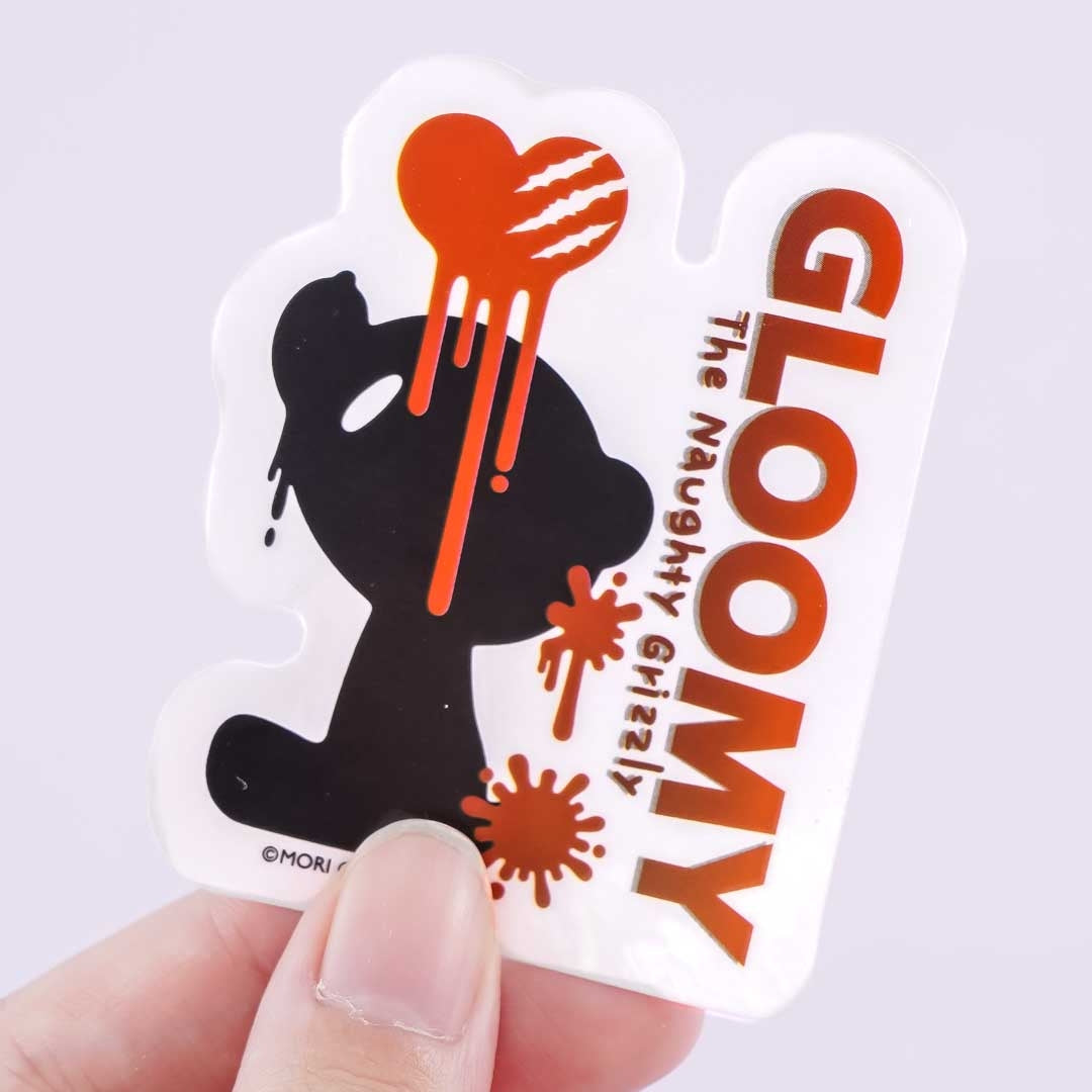 A kawaii Gloomy Bear deco sticker featuring Guru-mi’s silhouette, blood splatters, and a heart