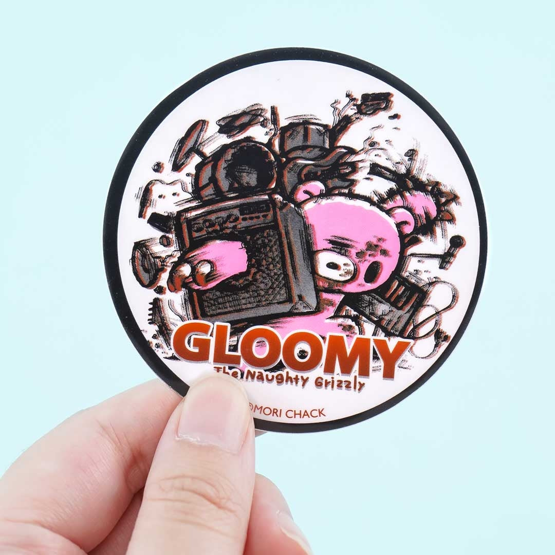 This round-shaped sticker features Guru-mi the pink violent bear getting angry over loud band music by destroying an amp and musical instruments! Jazz up your laptop case by placing this Gloomy Bear die-cut deco seal.