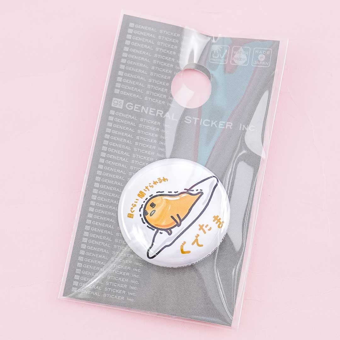 Add this mini-sized pin featuring Gudetama with wide eyes opened to your badge collection. Simply attach it to your fave jacket to kawaii-fy your look!