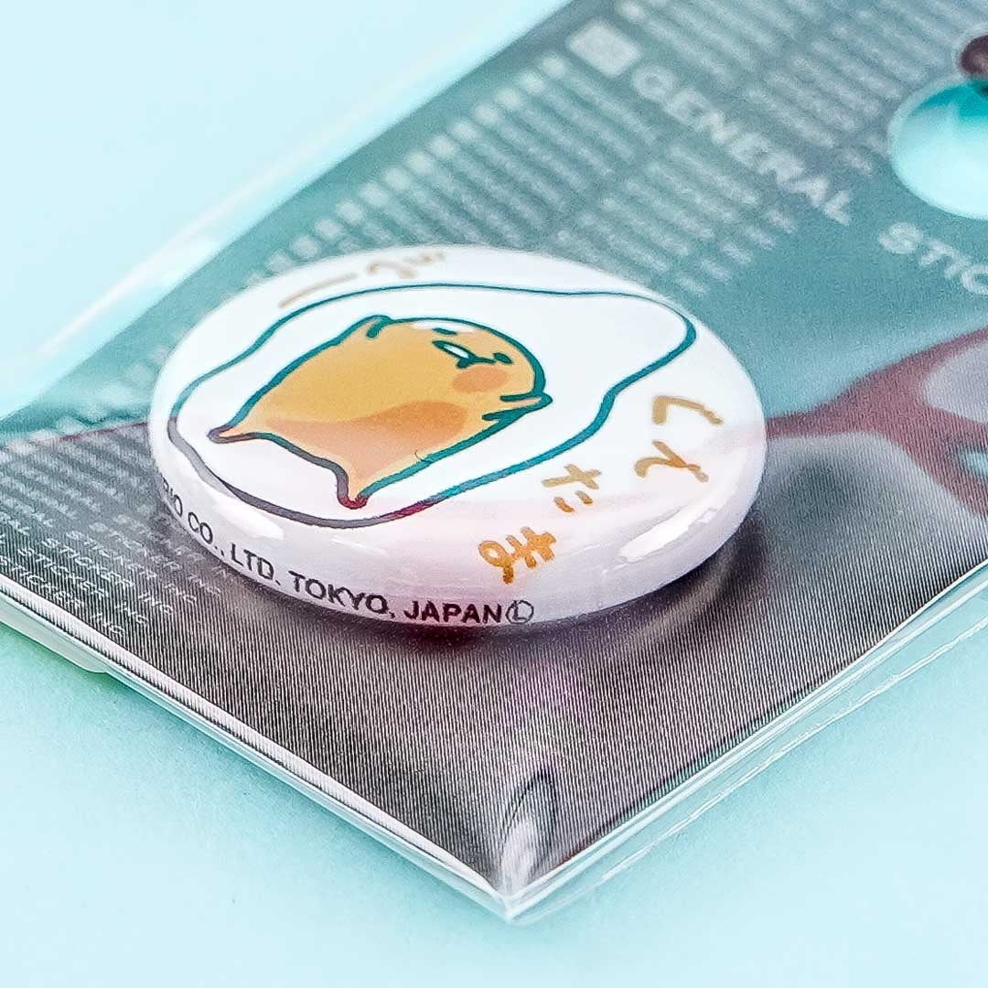 This cute mini badge features a print of Gudetama laying flat on his back. Add it to your kawaii badge collection!