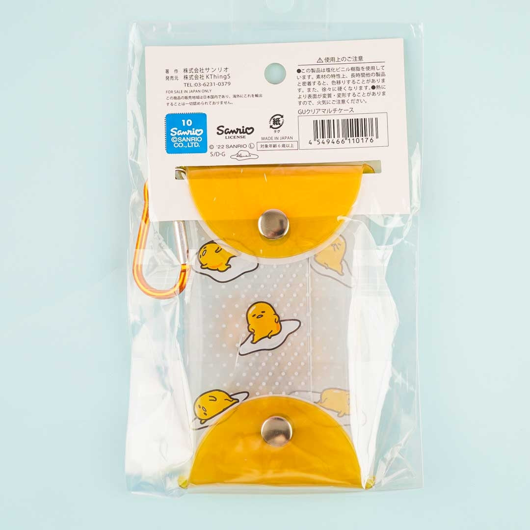 Keep your favorite hair clips inside this clear yellow plastic case! It has polka-dots and prints of Gudetama lying around on his rest day! This handy case also comes with dual snap button closures and a metal carabiner.