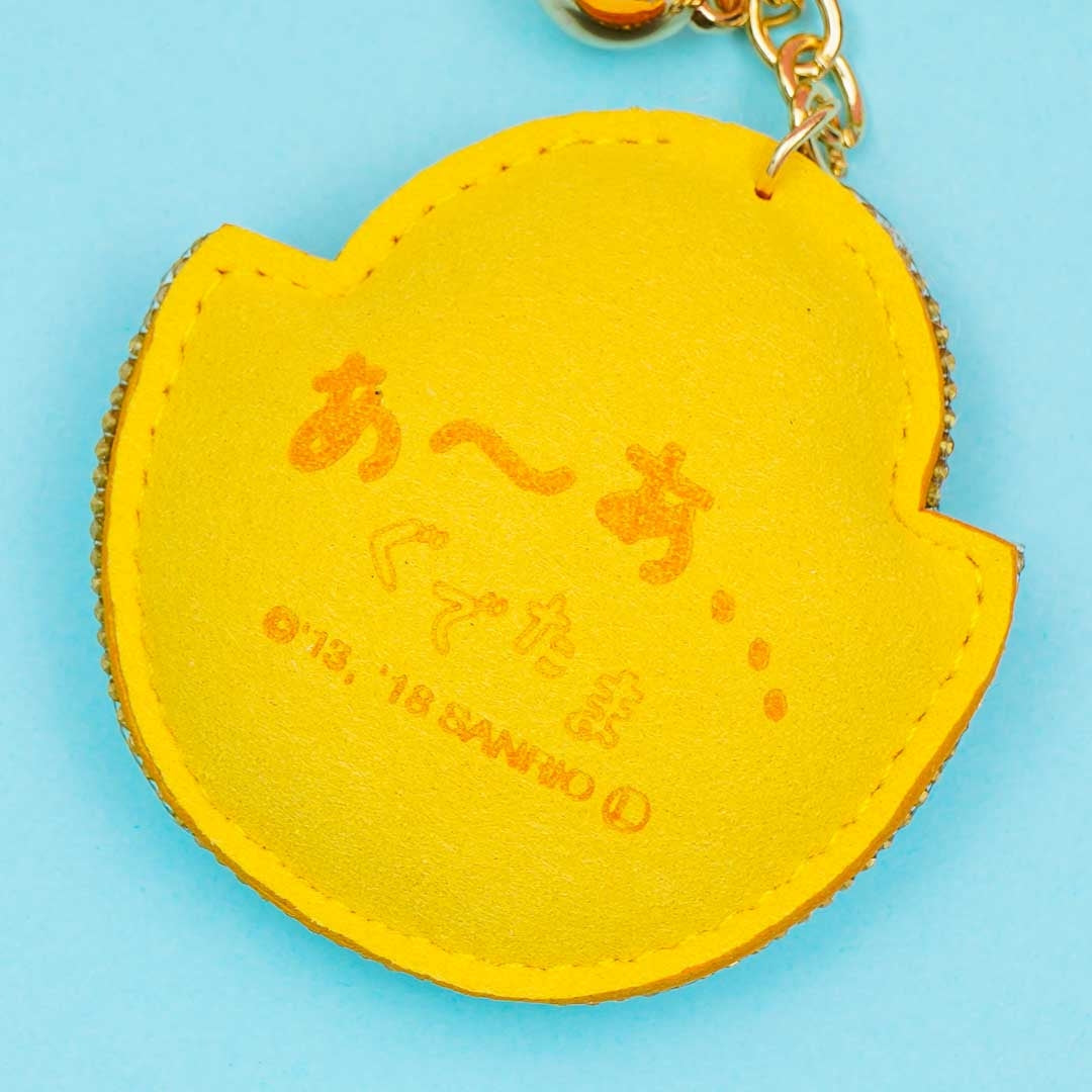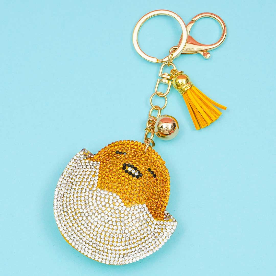 A cute Gudetama keychain made of sparkly rhinestones decorated on leather