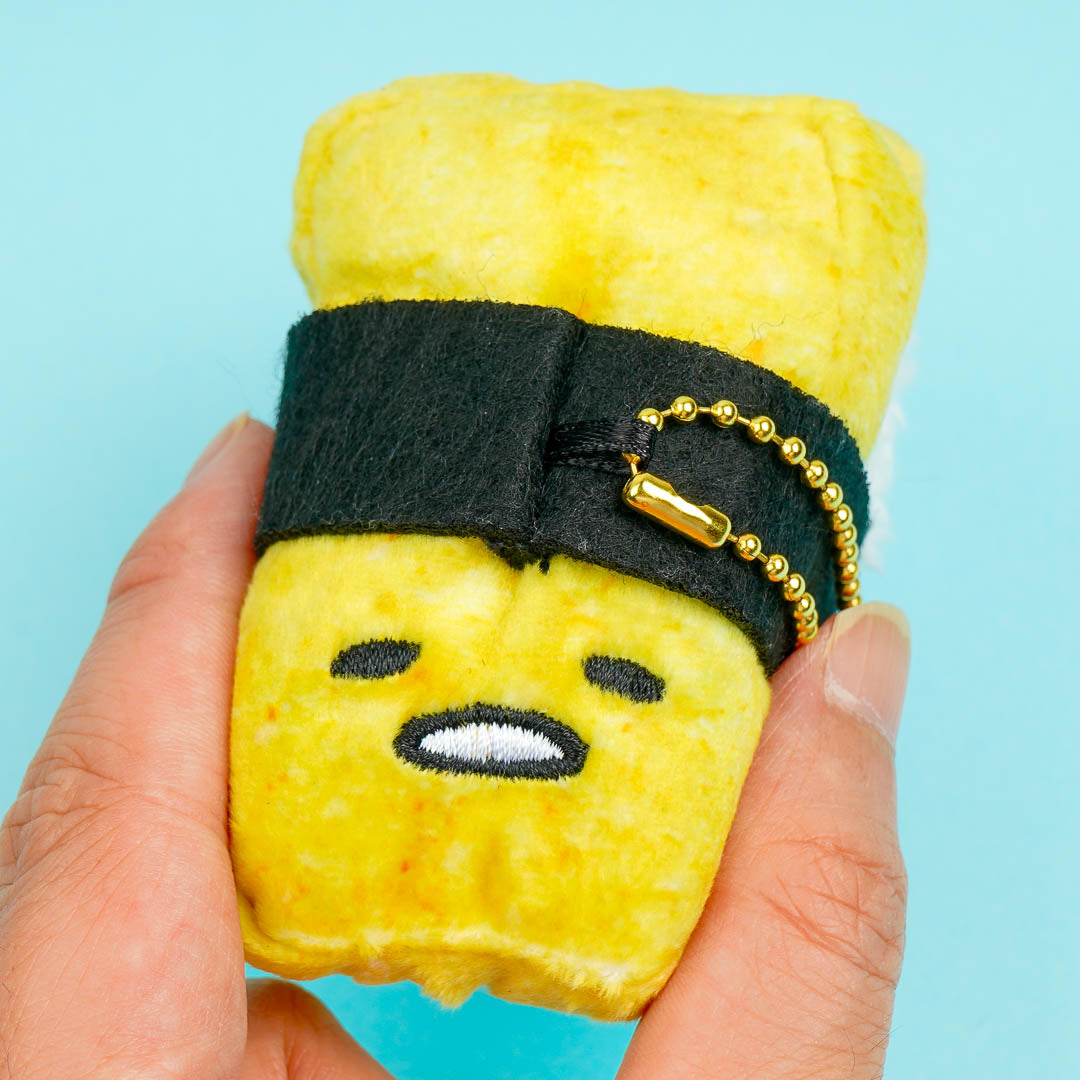 Add a touch of kawaii to your purse when you attach this super cute plushie charm! It looks like a tamago sushi with Gudetama's face.